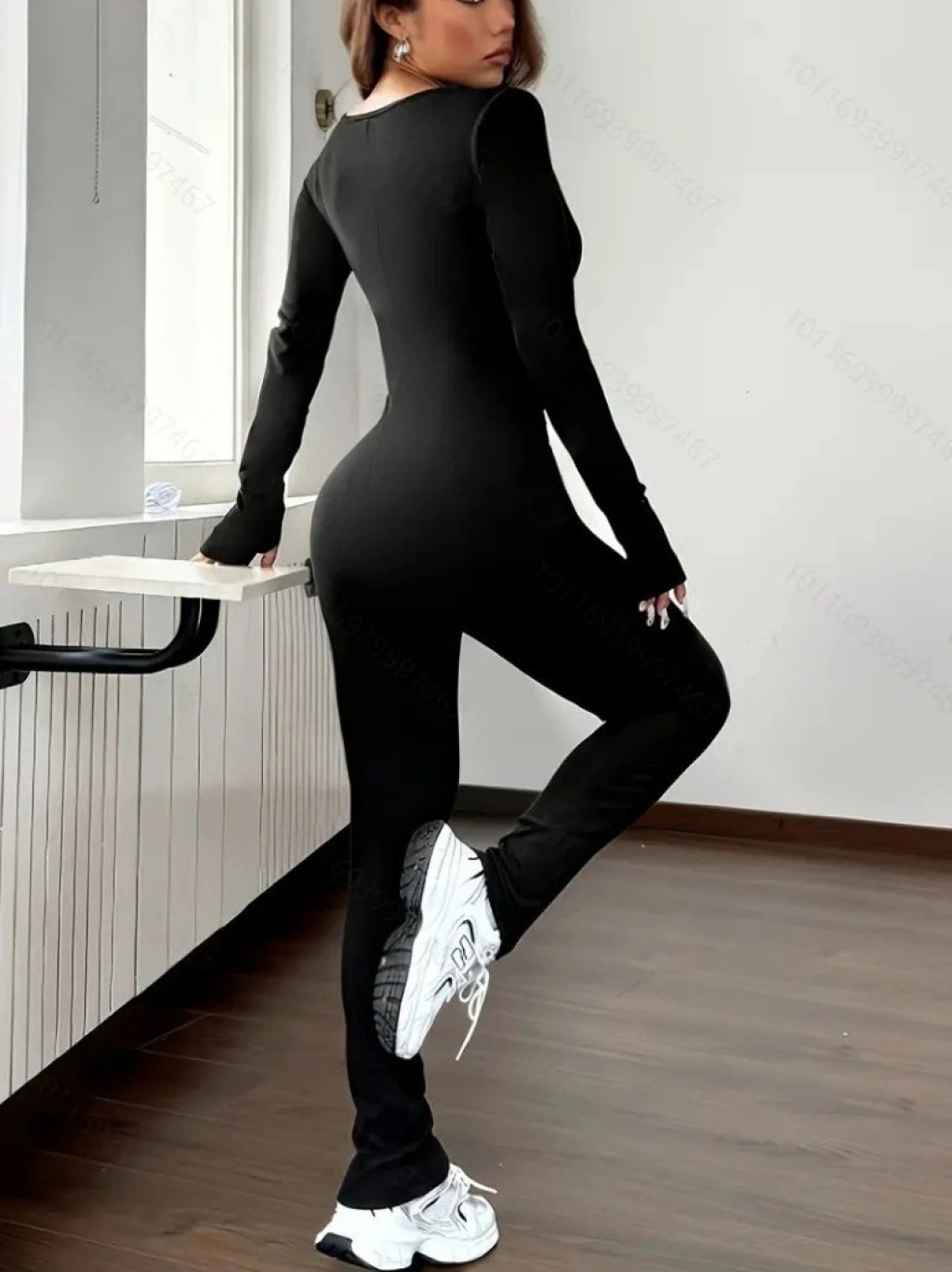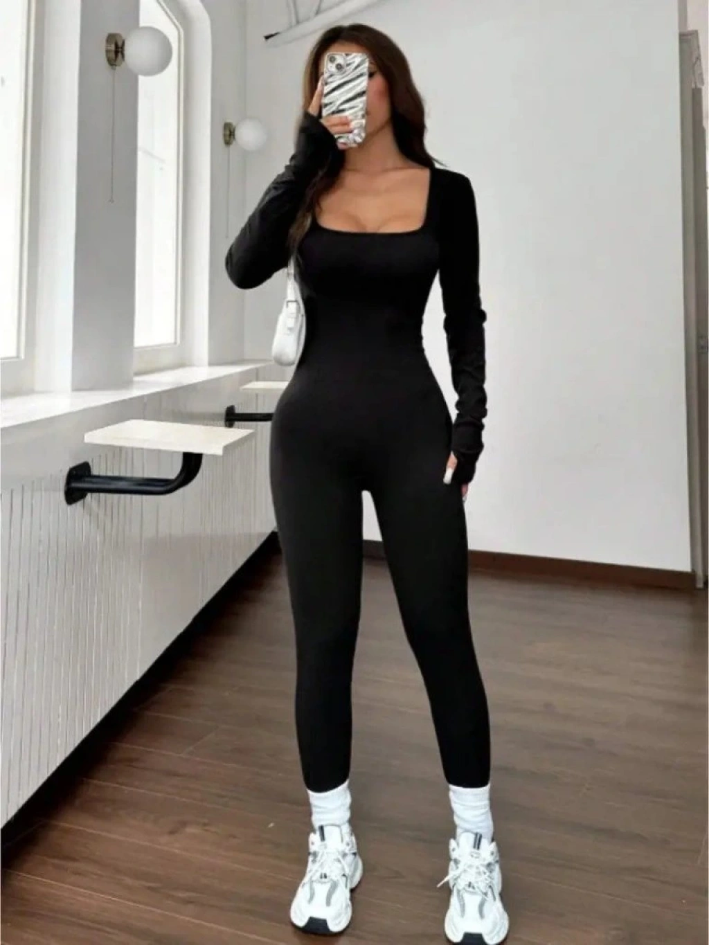 Kadın Uzun Kollu Kare Yakalı Fermuarlı Parmaktan Geçmeli Dalgıç Tulum