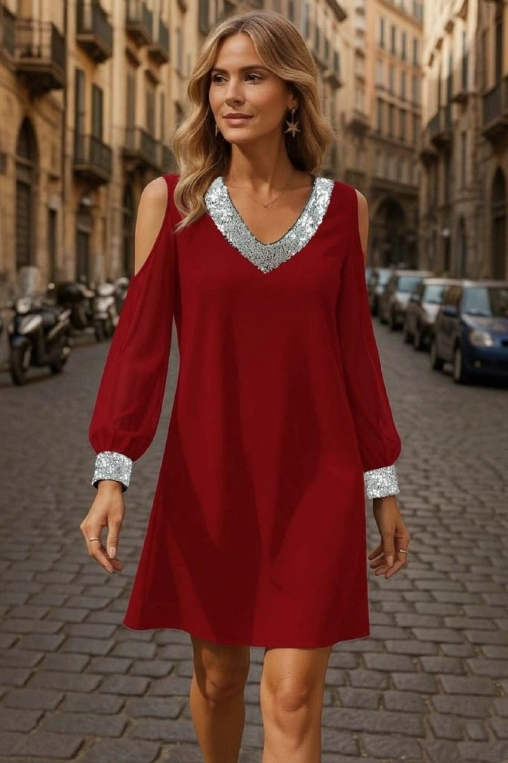 Kadın Uzun Kollu Kollar Tül V Yakalı Mini Janjan Krep Elbise