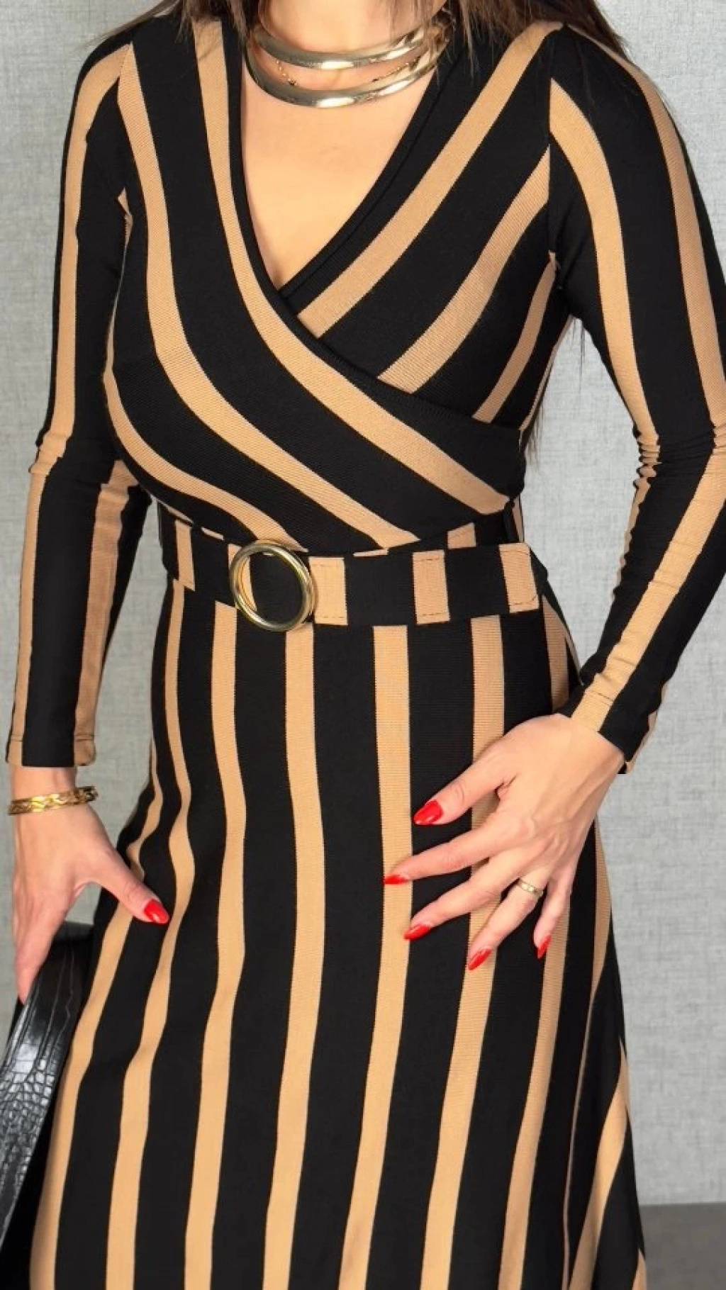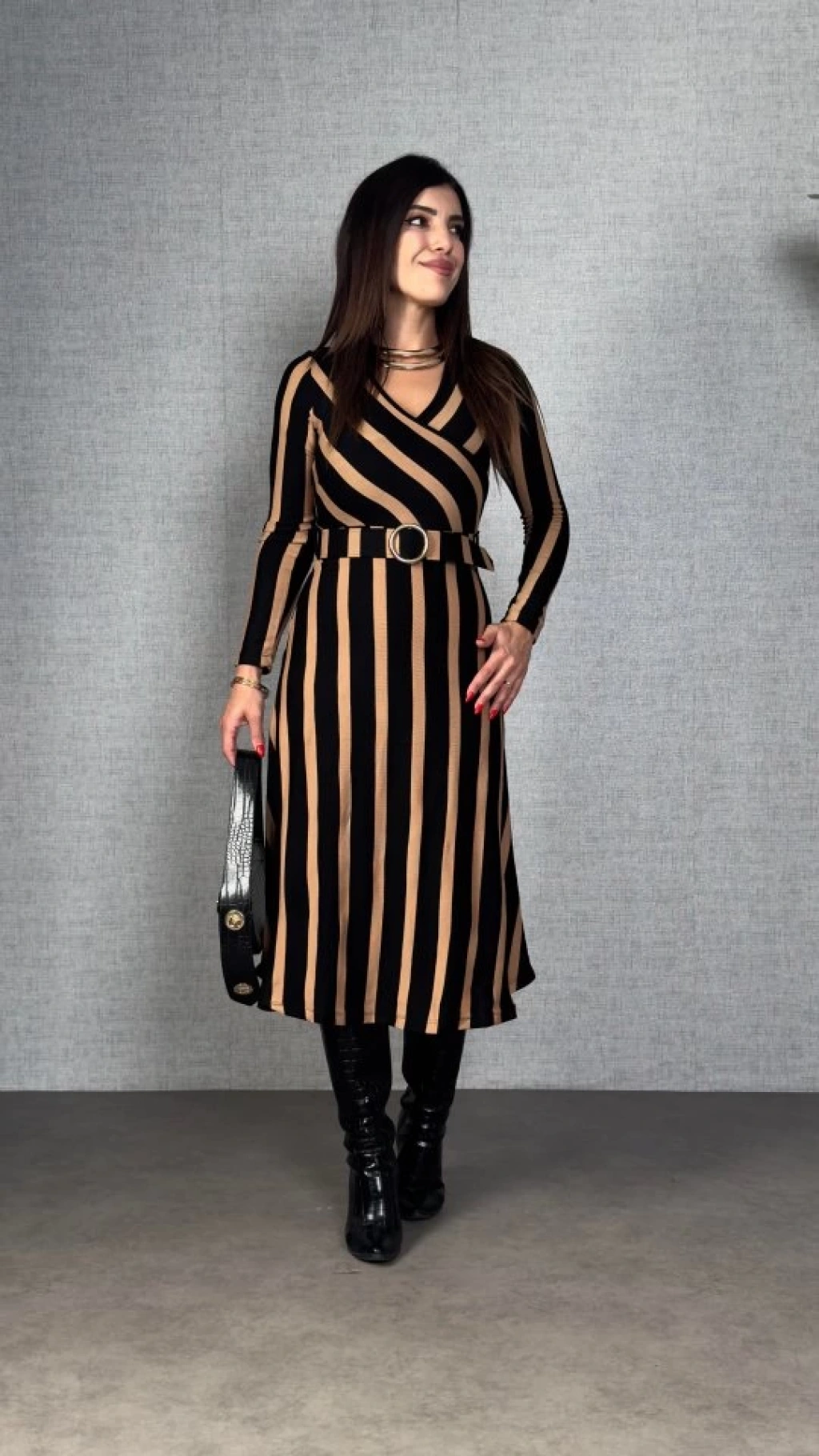 Kadın Uzun Kollu Kruvaze Yaka Kemer Dahil çizgili Triko Elbise