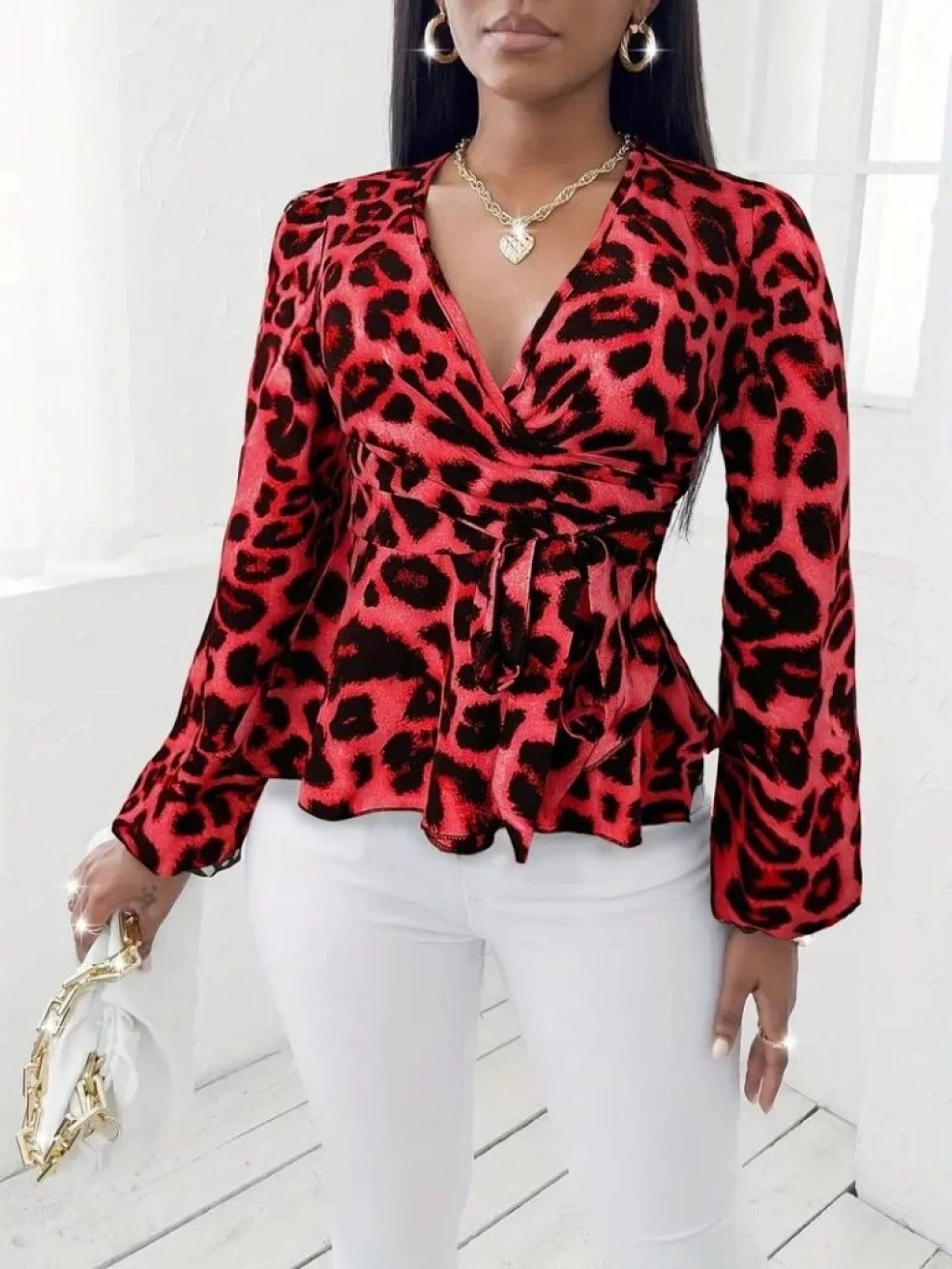 Kadın Uzun Kollu Kruvaze Yakalı Belden Kuşaklı Leopar Desenli Süprem Bluz
