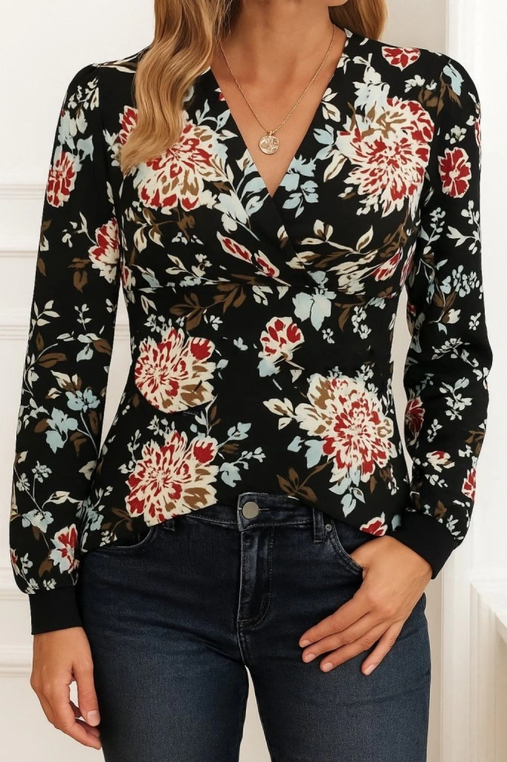 Kadın Uzun Kollu Kruvaze Yakalı Kelebek Desenli şardonlu Dalgıç Bluz