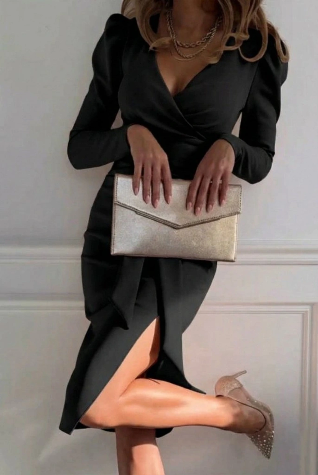 Kadın Uzun Kollu Kruvaze Yakalı Yandan Yırtmaçlı Belden Kuşaklı Midi Ithal Krep Elbise