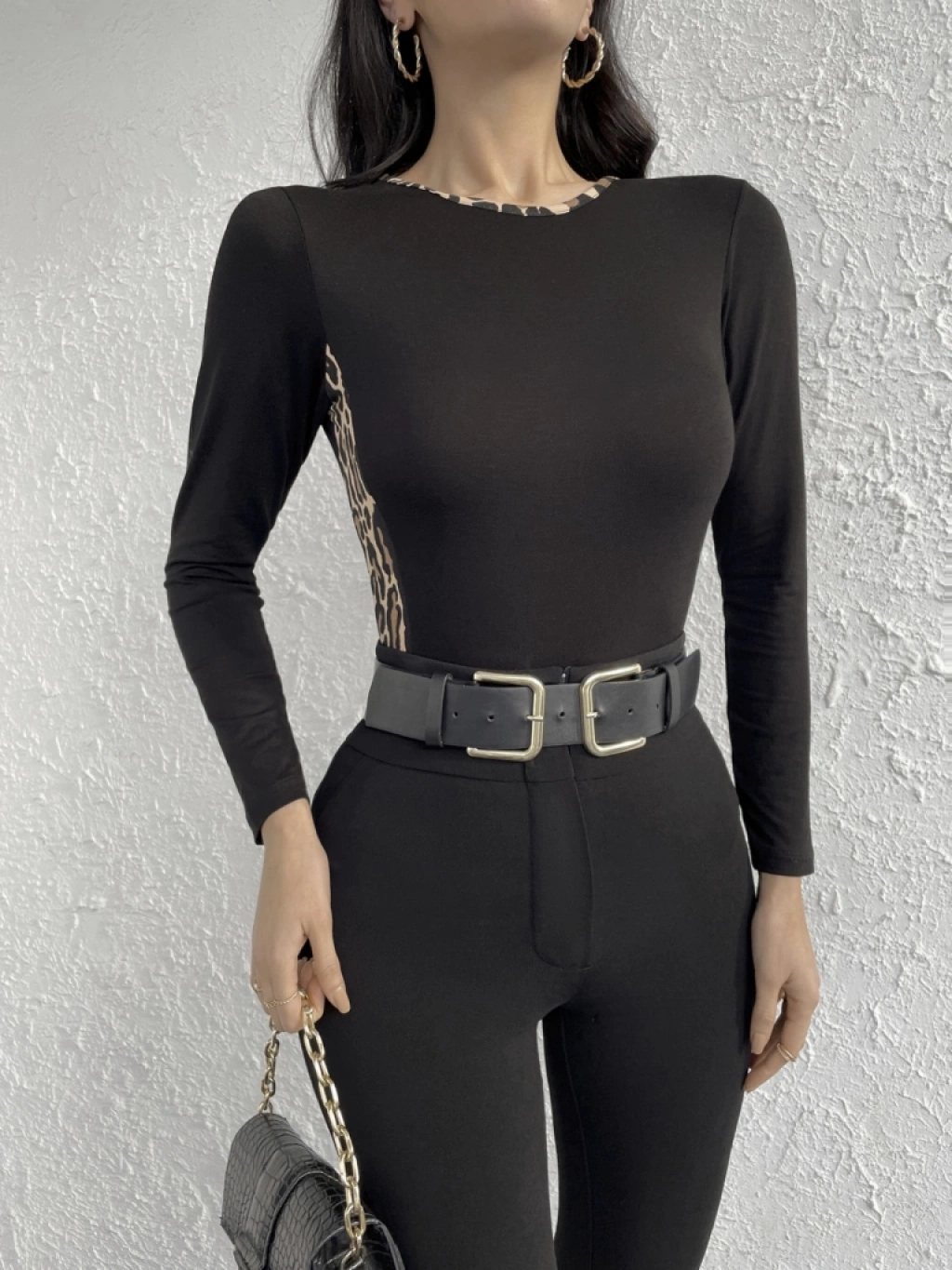 Kadın Uzun Kollu Leopar şeritli Viskon Bluz