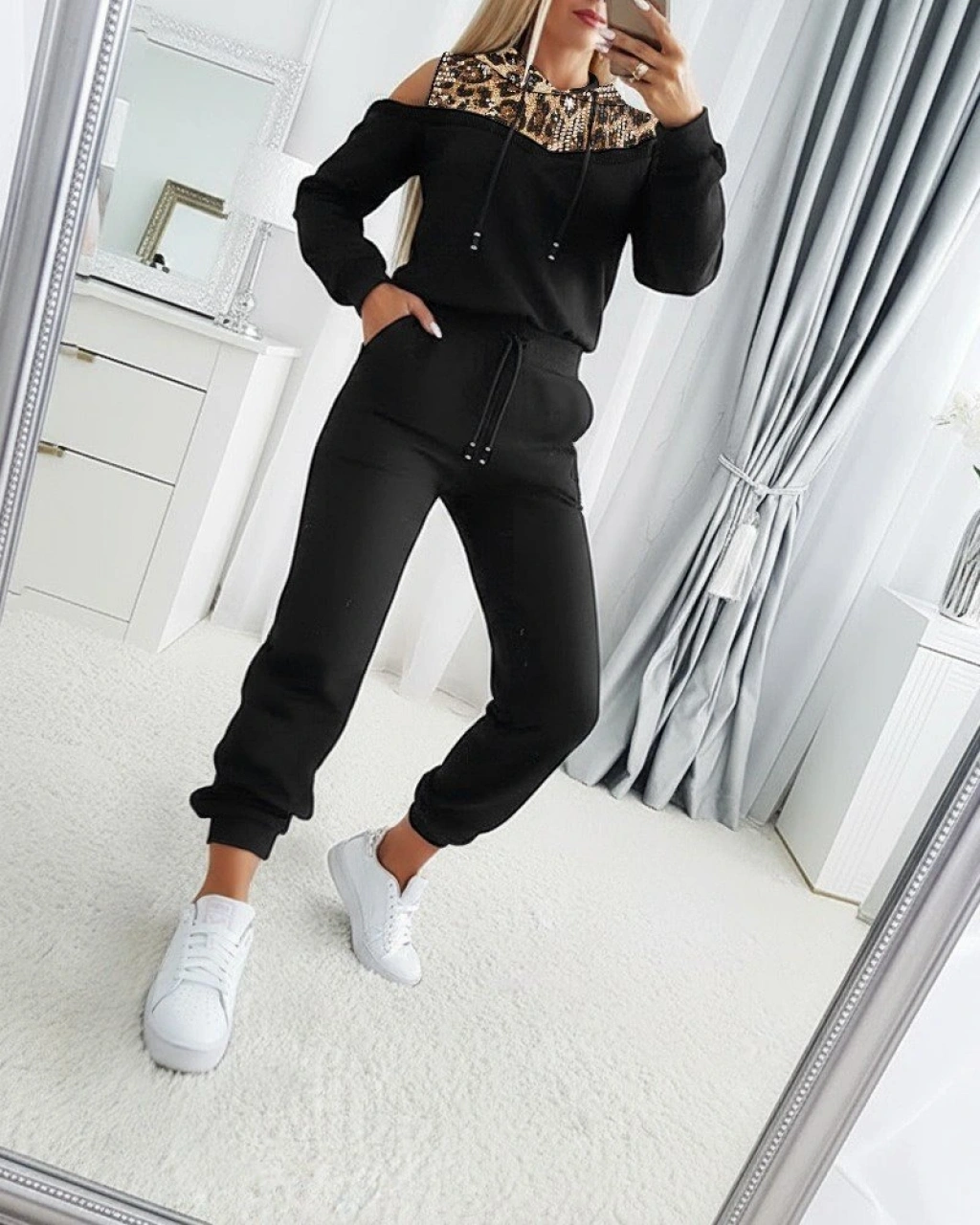 Kadın Uzun Kollu Omuzlardan Açık Leopar Desenli Kapşonlu Viskon Iki Iplik Bluz Ve Pantolon Ikili Takım