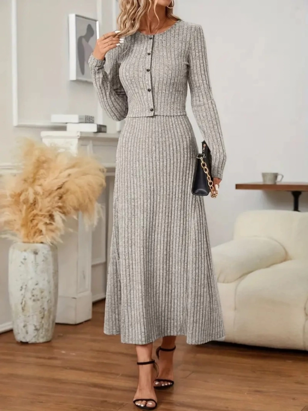 Kadın Uzun Kollu önden Düğmeli Bluz Ve Yüksek Bel A Kesim Uzun Etek şardonlu Kaşkorse Ikili Takım