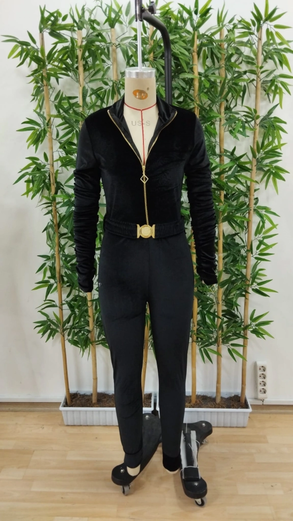 Kadın Uzun Kollu önden Fermuar Detaylı Kemerli Kadife Tulum