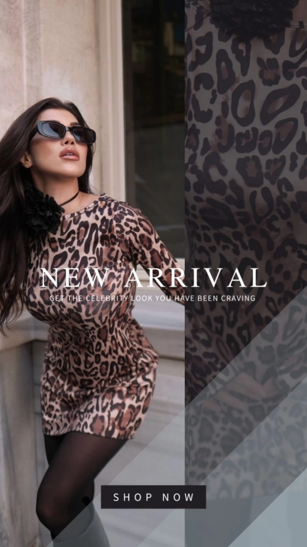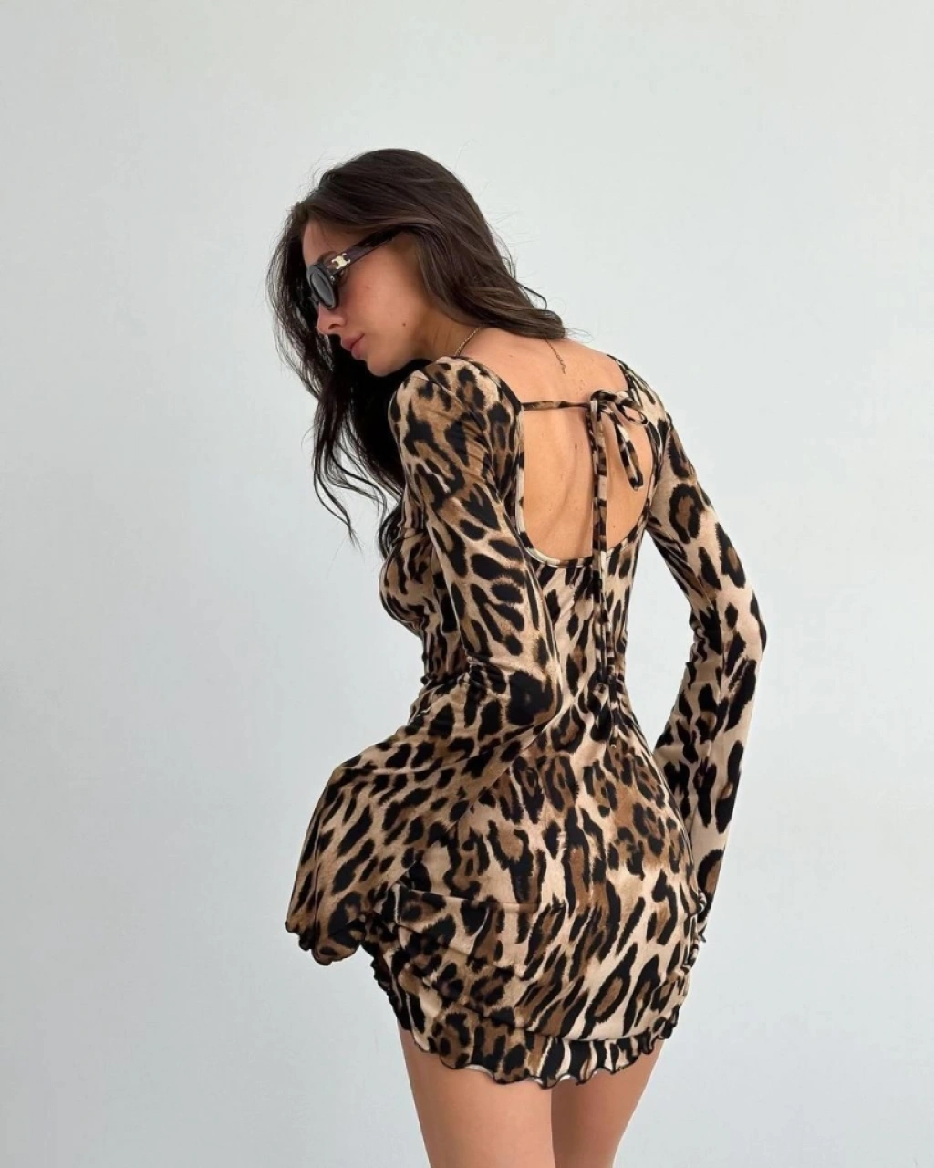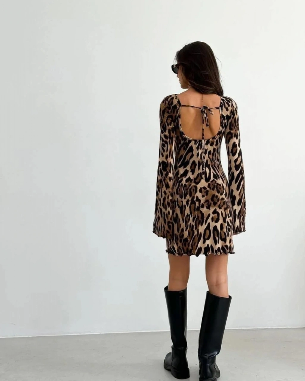 Kadın Uzun Kollu Sırtı Açık Bağlamalı Leopar Desenli Kısa Dalgıç Elbise