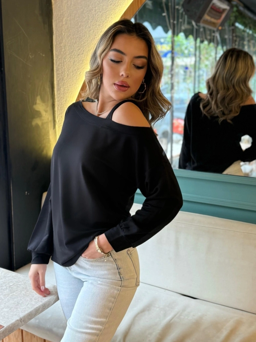 Kadın Uzun Kollu Tek Omuz Askı Detay Salaş Viskon Iki Iplik Bluz