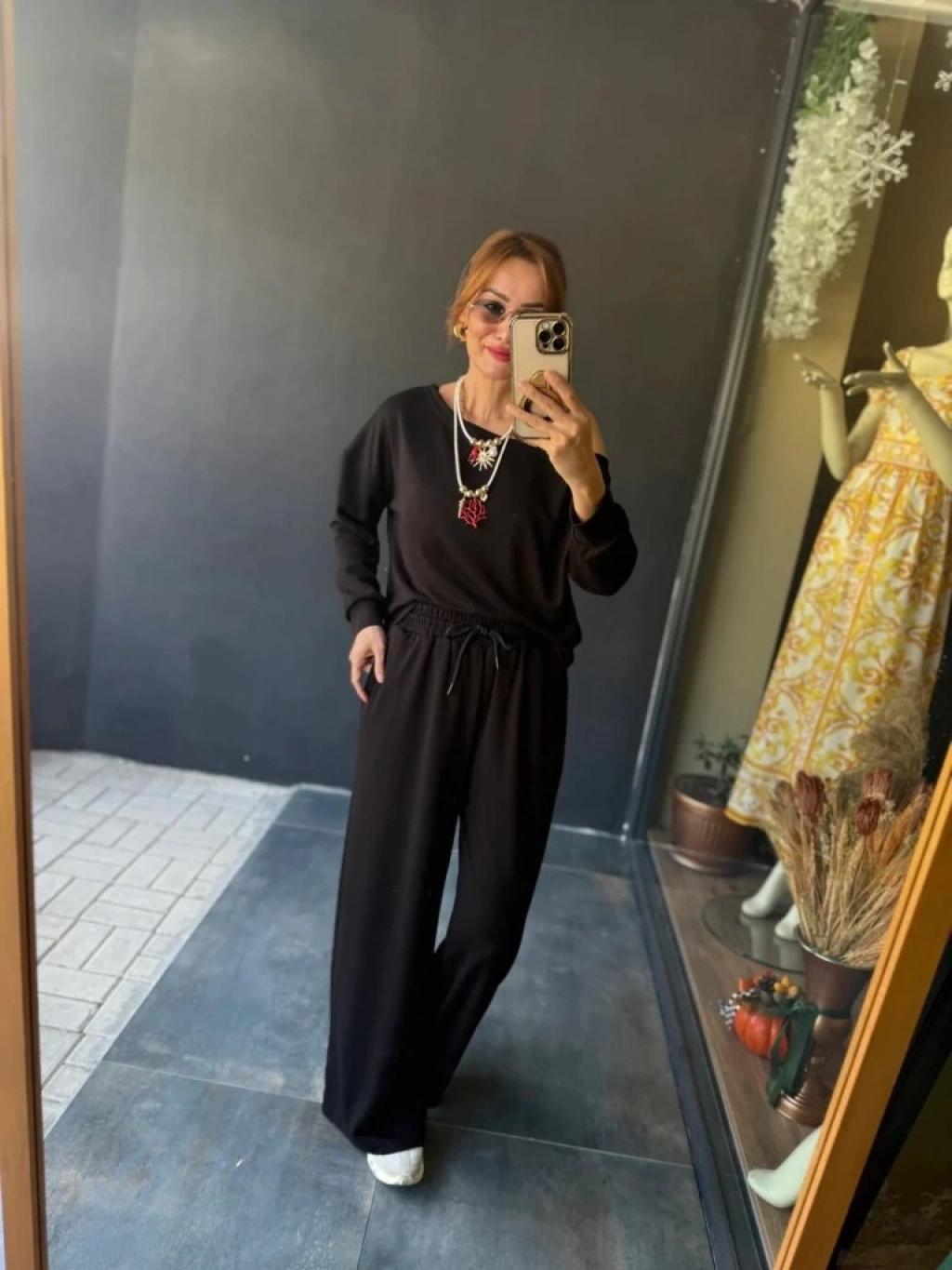 Kadın Uzun Kollu Tek Omuzdan Açık Viskon Iki Iplik Bluz Ve Pantolon Ikili Takım