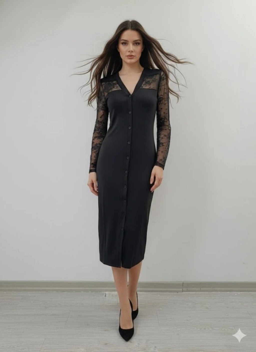 Kadın Uzun Kollu Transparan Detay Midi Boy Elbise