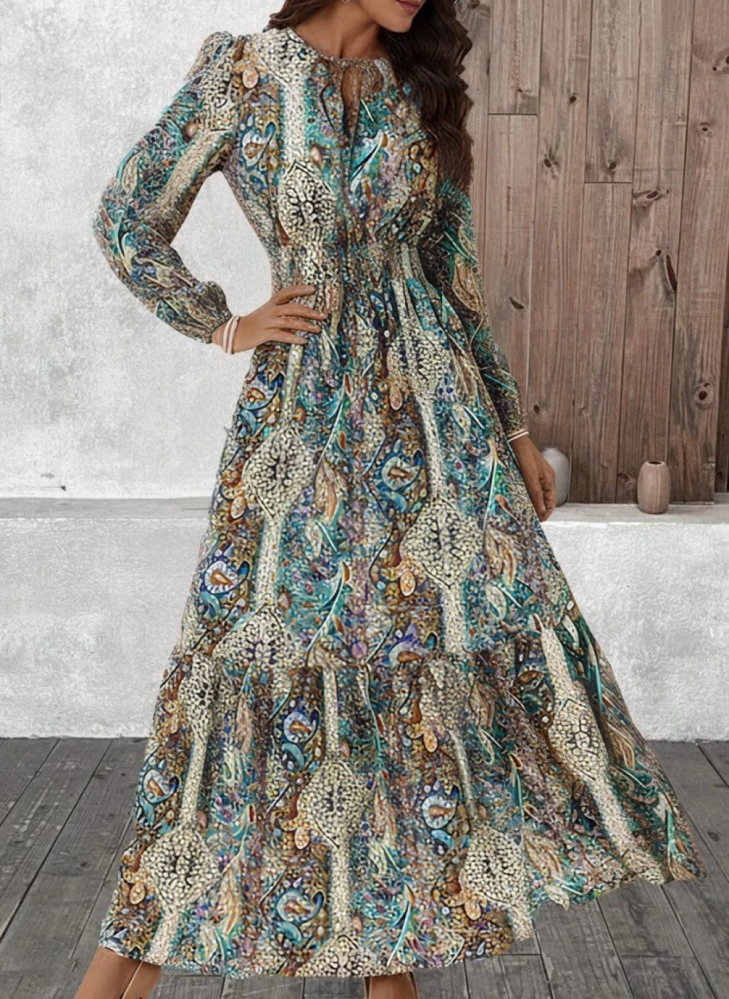 Kadın Uzun Kollu Uakadabağcıklı Beli Lastikli Desenli Uzun Süprem Elbise