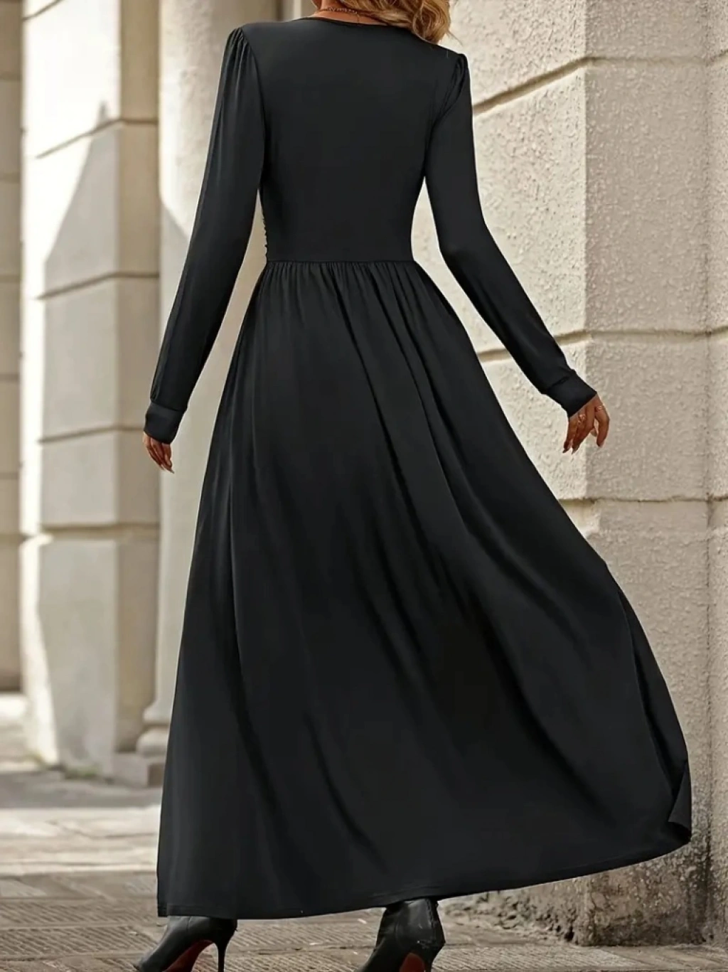 Kadın Uzun Kollu V Dantel Yakalı Yırtmaçlı Uzun Sandy Elbise
