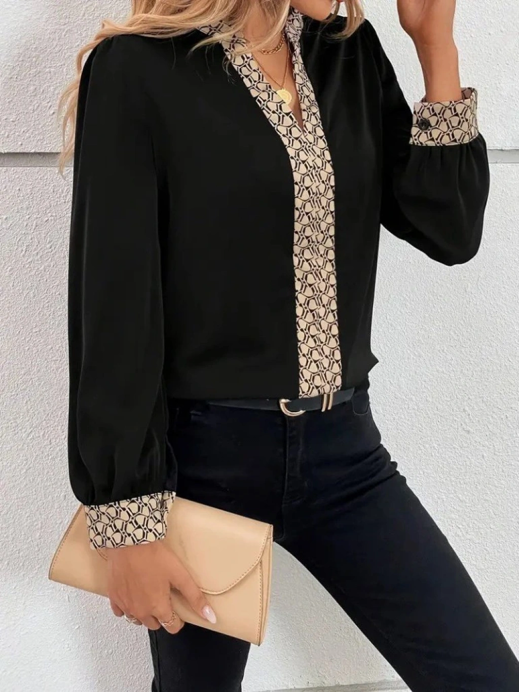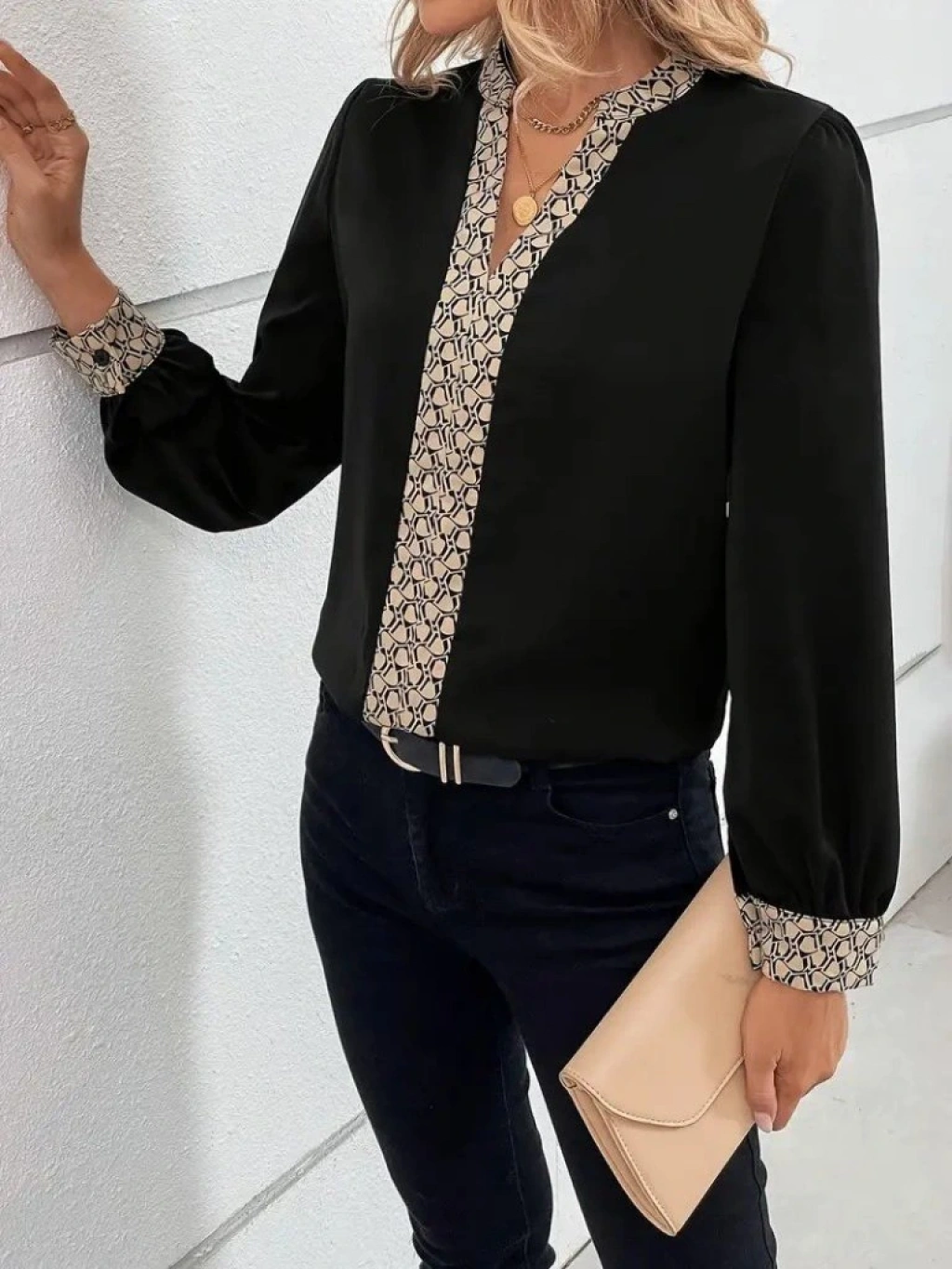 Kadın Uzun Kollu V Hakim Yakalı Desenli Ithal Krep Bluz