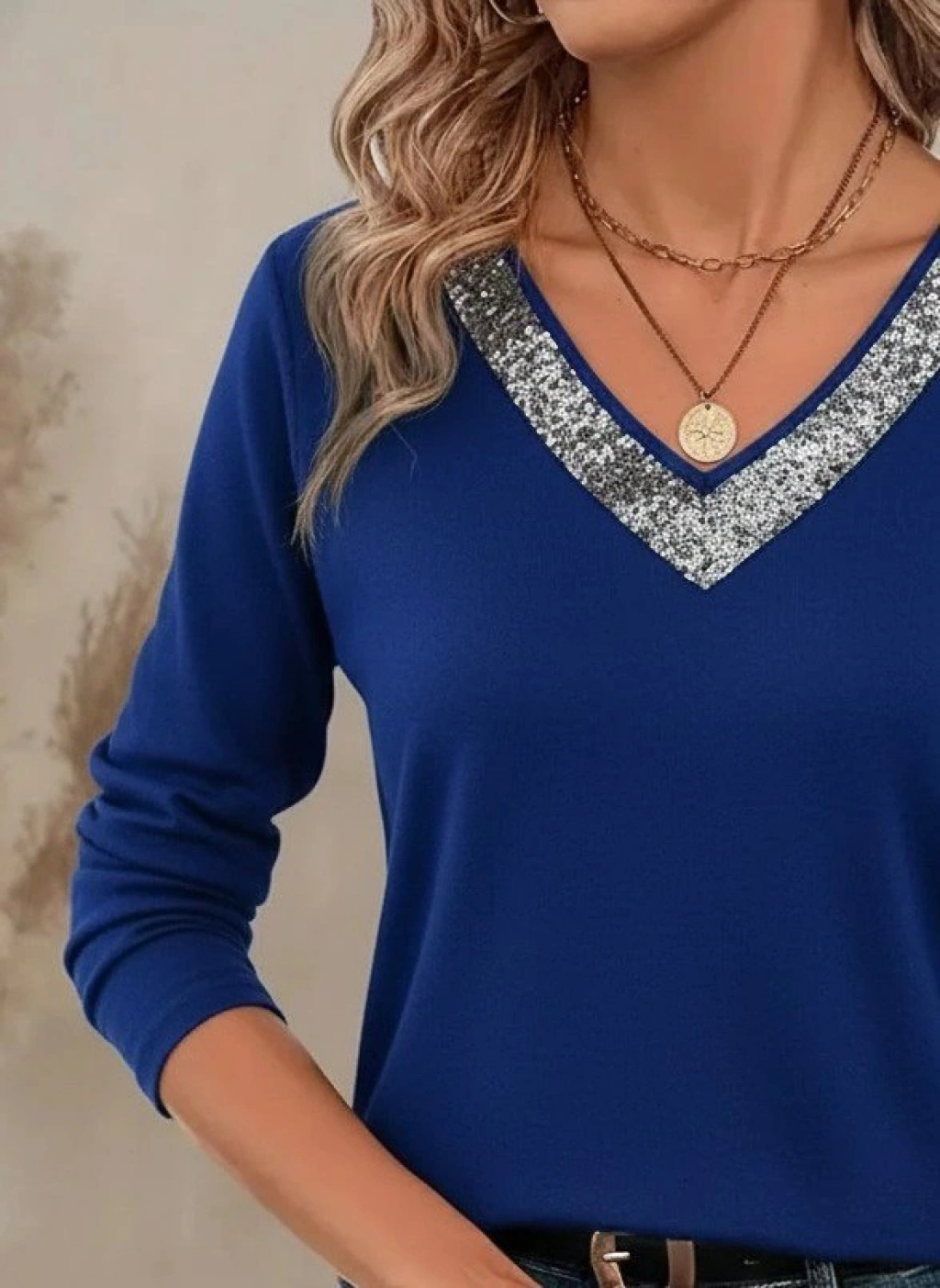 Kadın Uzun Kollu V Payet Yakalı Viskon Bluz