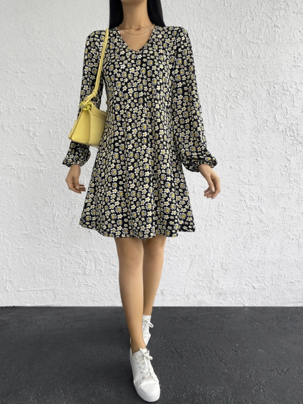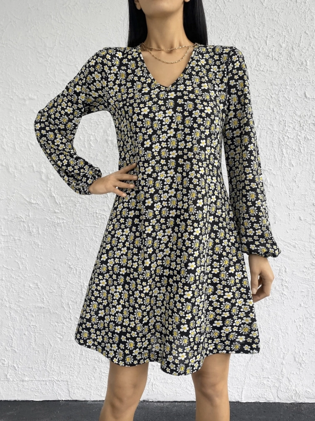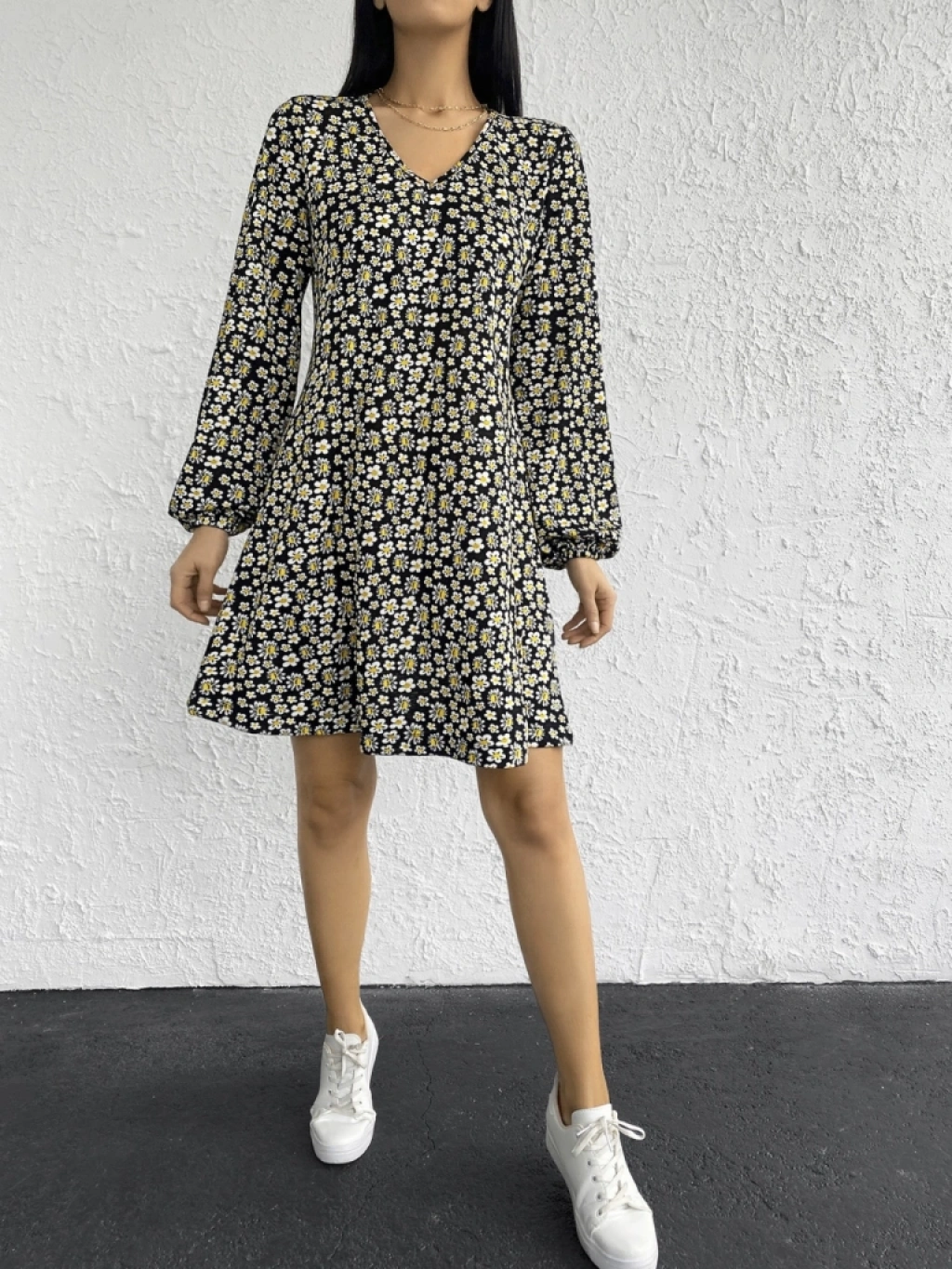 Kadın Uzun Kollu V Yaka çiçek Desenli Helen Kumaş Elbise