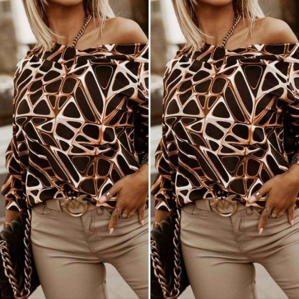 Kadın Uzun Kollu V Yaka Düşük Omuz Geometrik Desen şardonlu Dalgıç Bluz