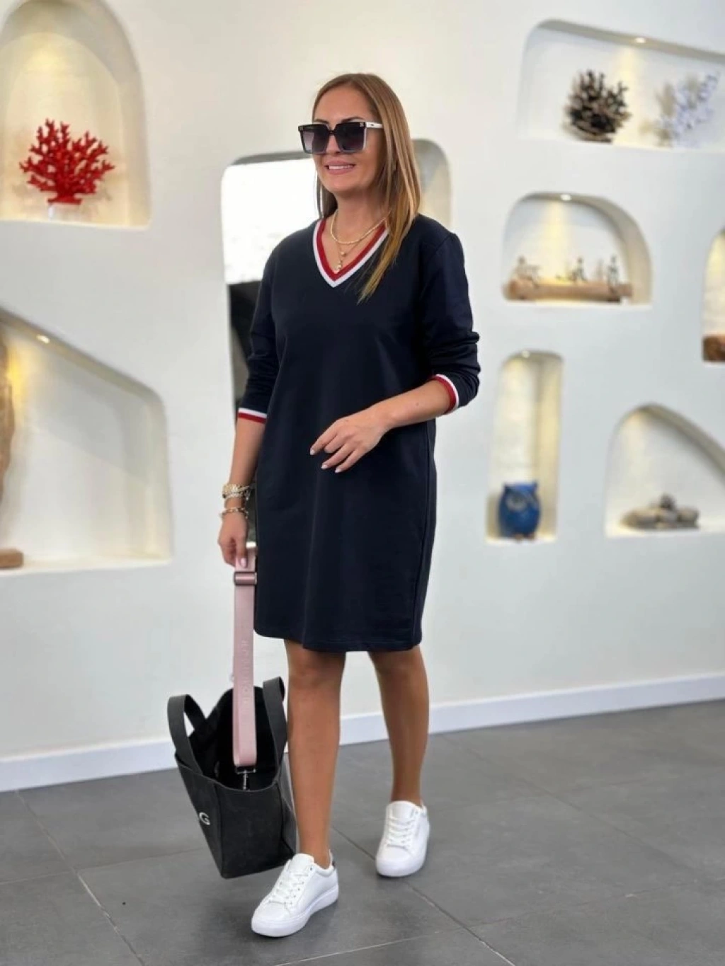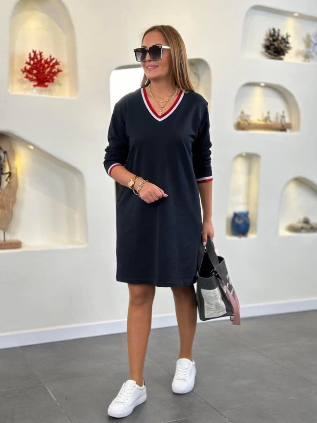 Kadın Uzun Kollu V Yaka Kol Ağzı Ve Yaka Ribana Detaylı Iki Iplik Mini Boy Elbise