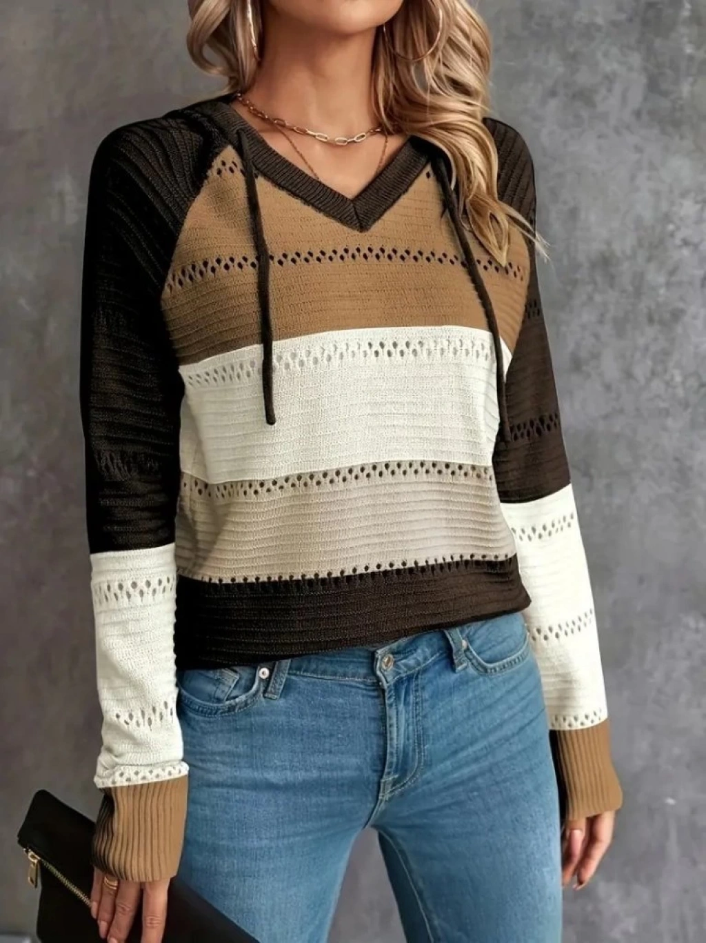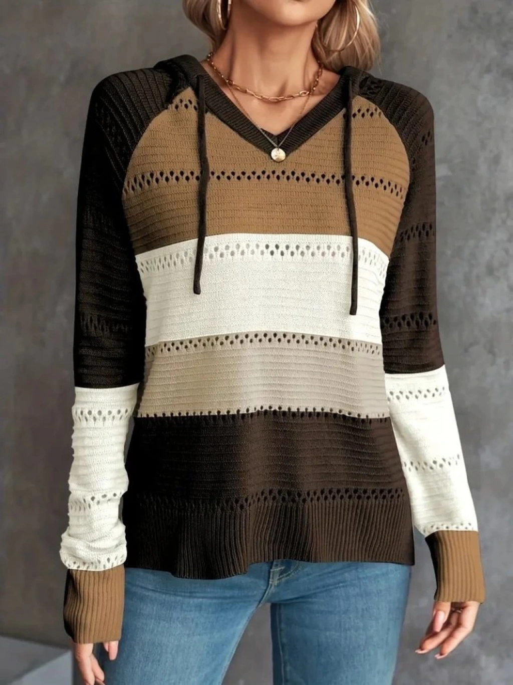 Kadın Uzun Kollu V Yakalı Bağcıklı Kapşonlu Triko Bluz