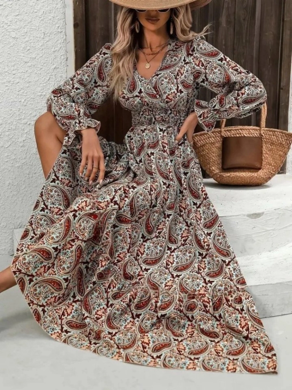 Kadın Uzun Kollu V Yakalı Beli Lastikli Desenli Süprem Elbise