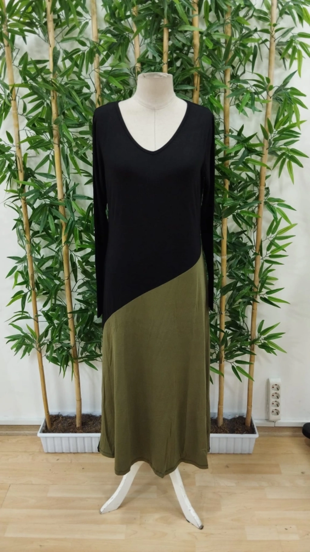 Kadın Uzun Kollu V Yakalı Blok Desenli Viskon Elbise
