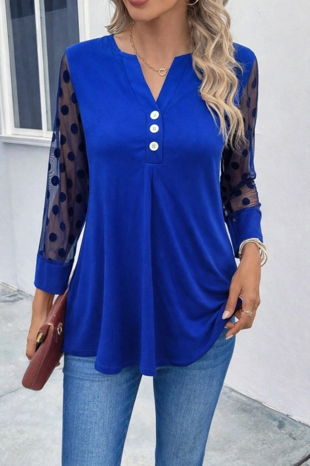 Kadın Uzun Kollu Yakadan Düğmeli Kolları Tül Detaylı Viskon Bluz