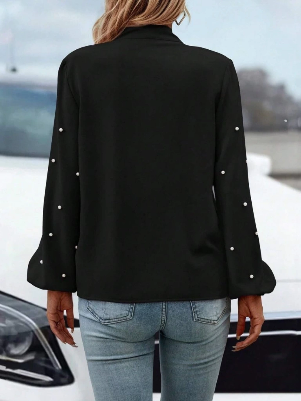 Kadın Uzun Kollu Yakadan Fiyonklu Incili Ithal Krep Bluz