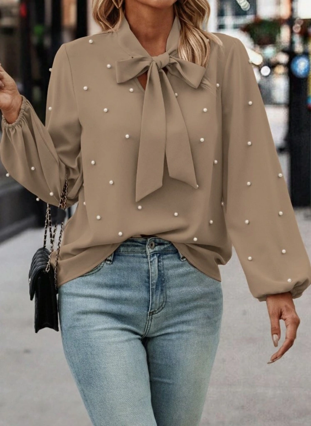 Kadın Uzun Kollu Yakadan Fiyonklu Incili Ithal Krep Bluz
