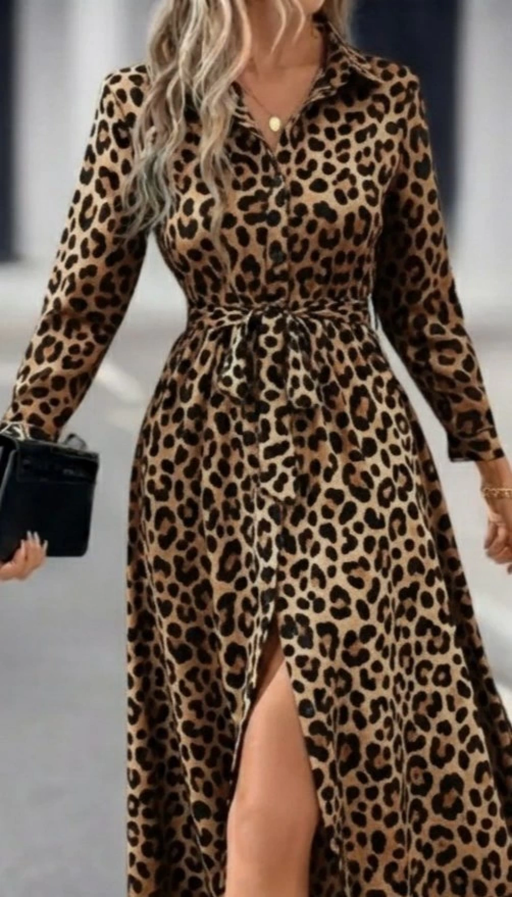 Kadın Uzun Kollu Yakalı Belden Kuşaklı Leopar Desenli Modal Uzun Elbise