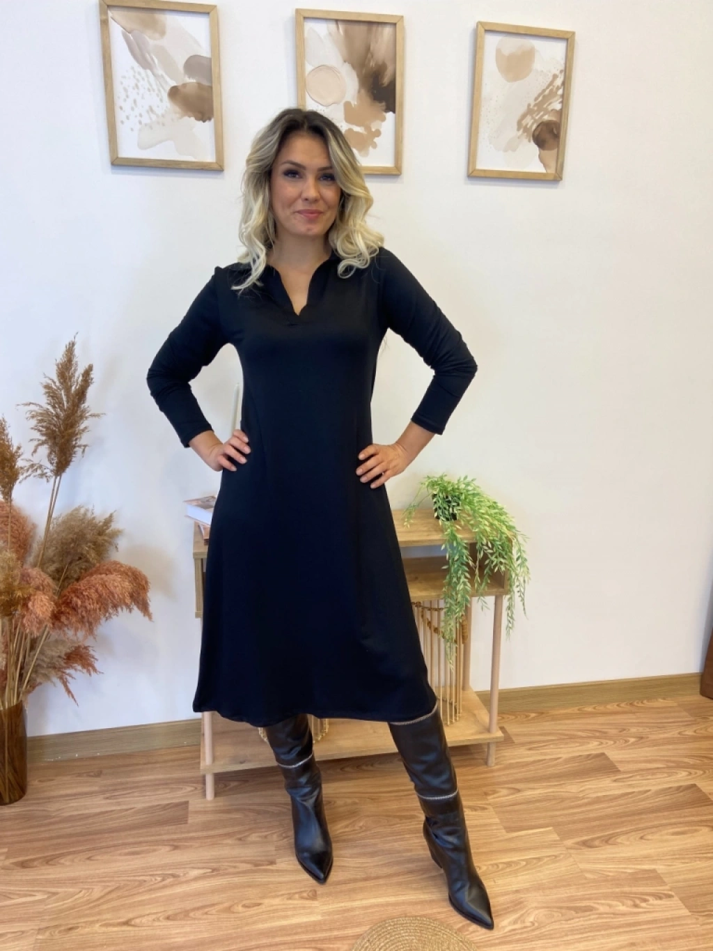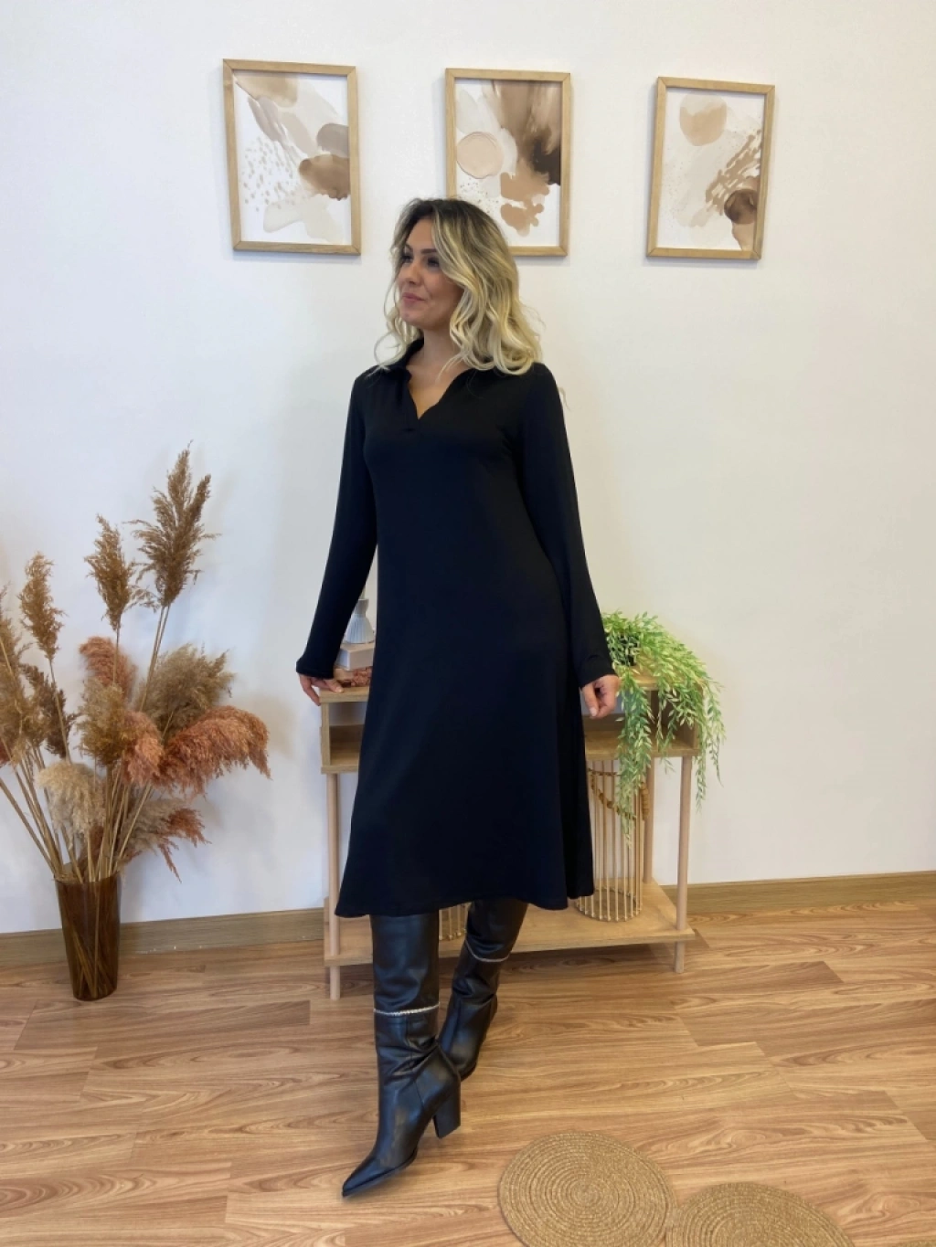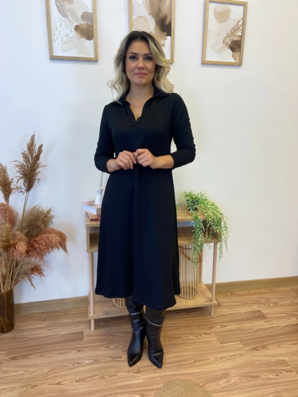 Kadın Uzun Kollu Yakalı Midi Viskon Iki Iplik Elbise