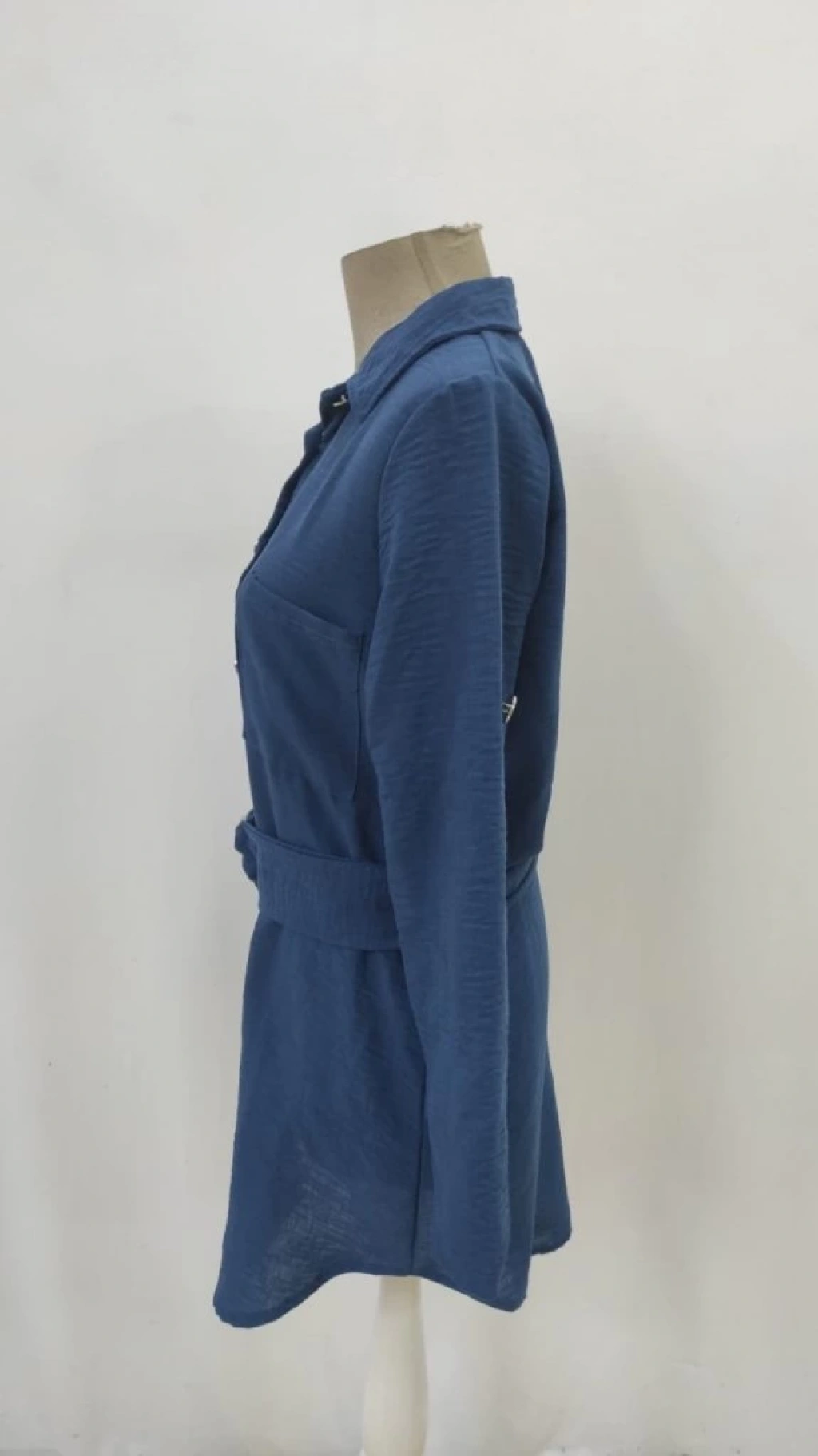 Kadın Uzun Kollu Yakalı önden Düğmeli Beli Kuşaklı Mini Ithal Keten Elbise
