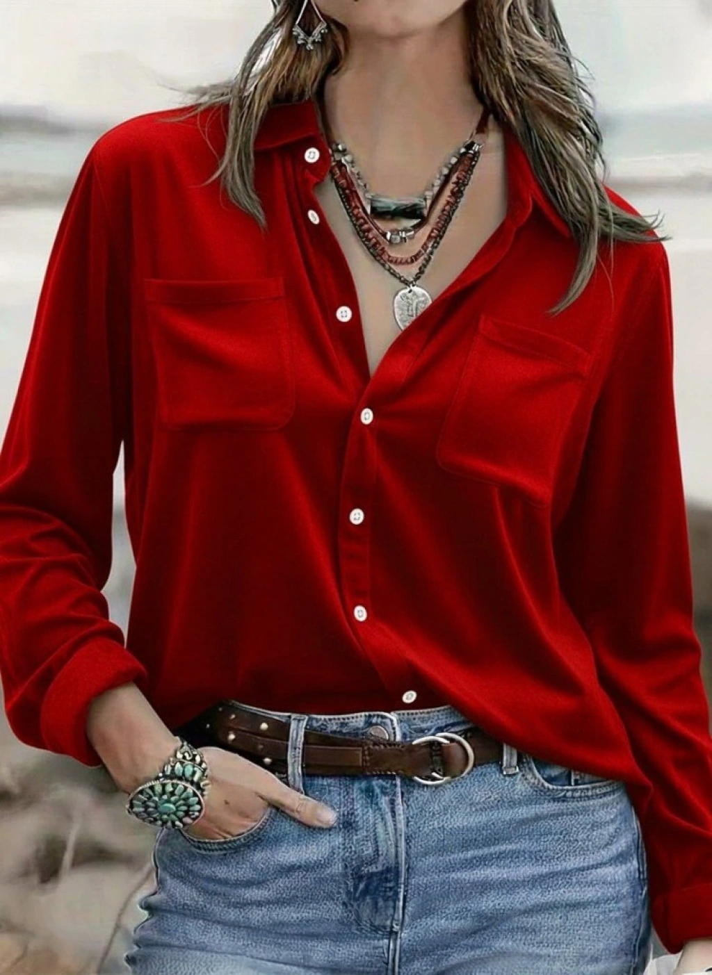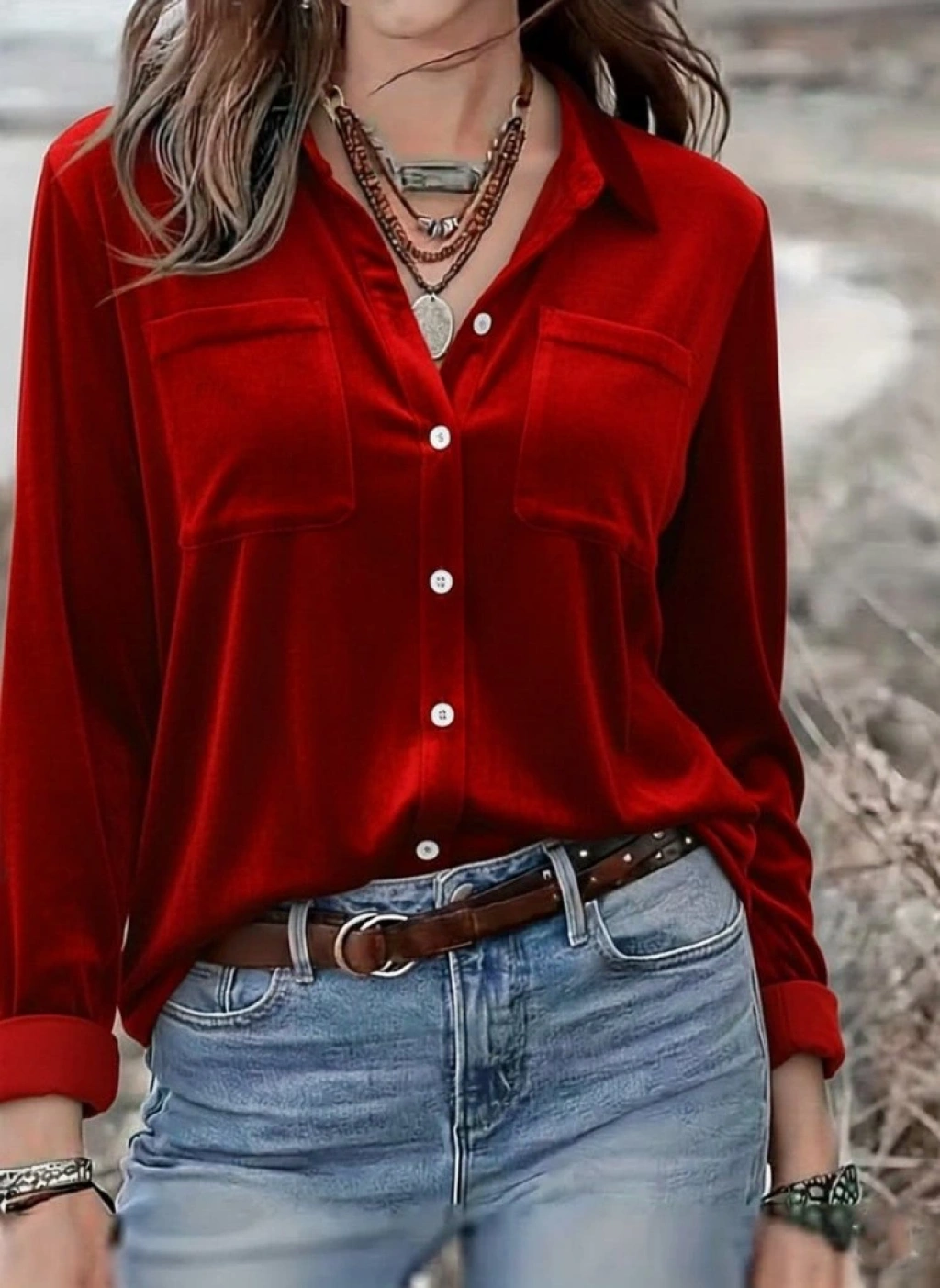 Kadın Uzun Kollu Yakalı önden Düğmeli Cep Detaylı Kadife Gömlek