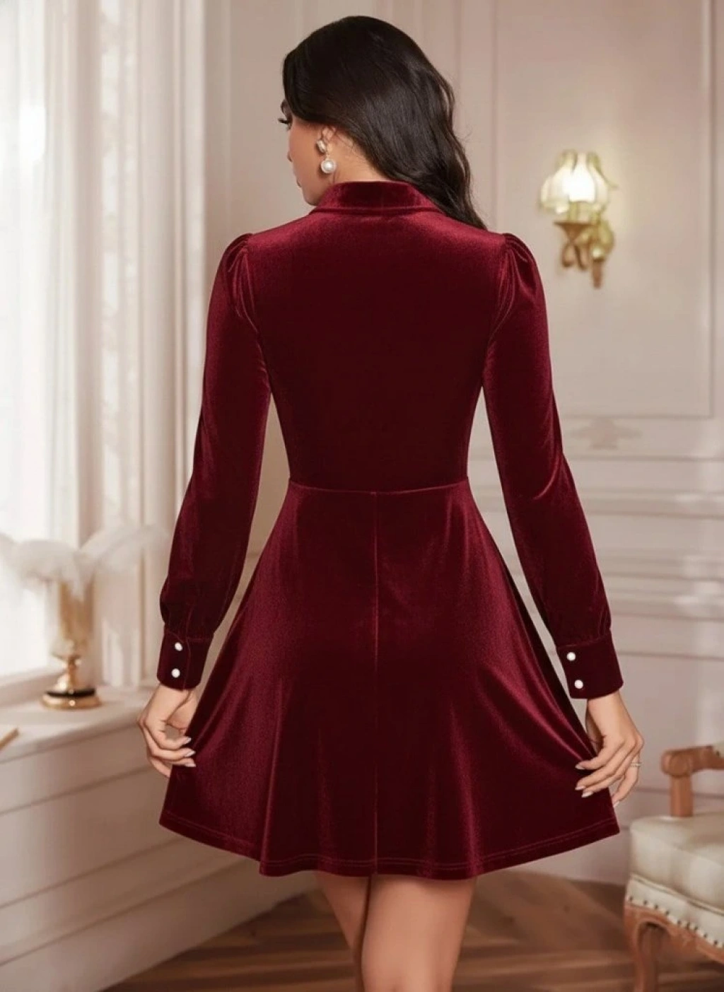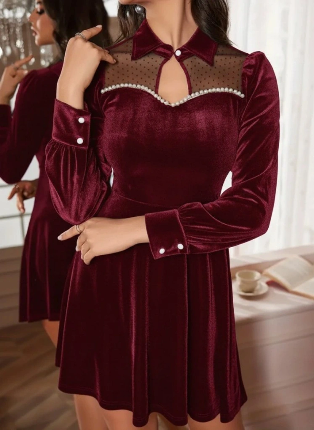 Kadın Uzun Kollu Yakalı Tül Detaylı Incili Mini Kadife Elbise