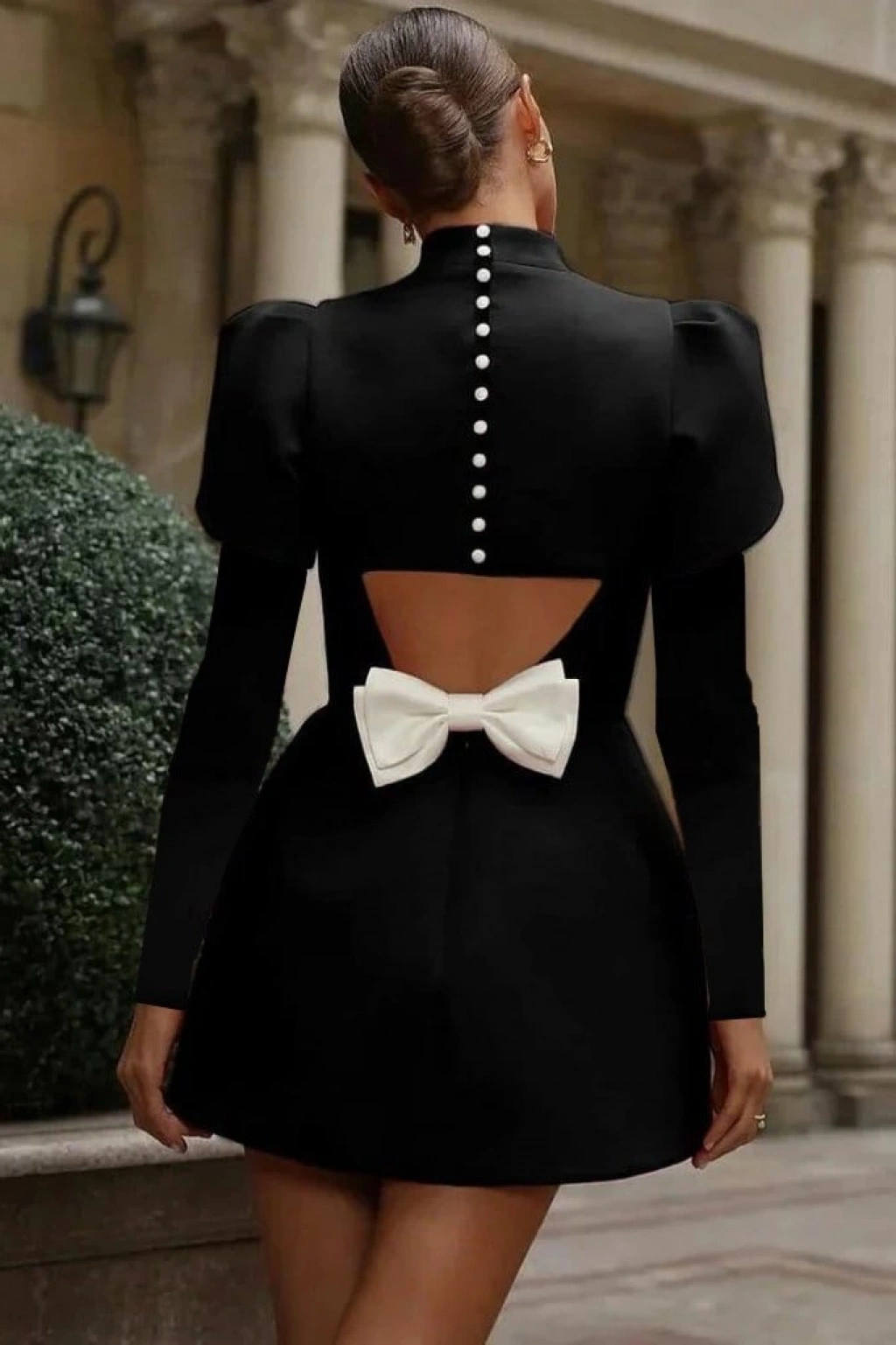 Kadın Uzun Kollu Yarı Balıkçı Yaka Arkadan Kurdela Detaylı Mini Atlas Elbise
