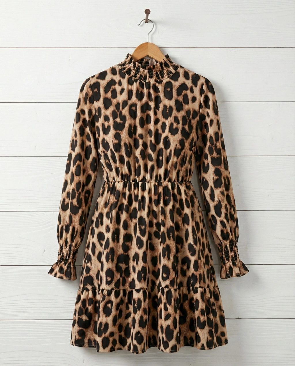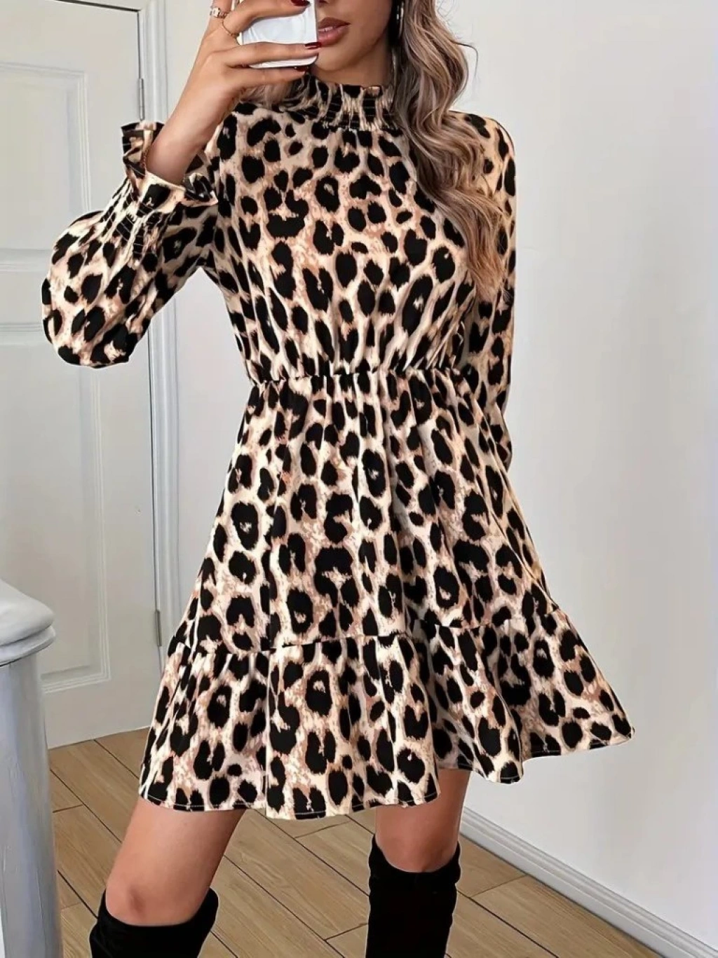 Kadın Uzun Kollu Yarı Balıkçı Yaka Leopar Desenli Modal Mini Elbise