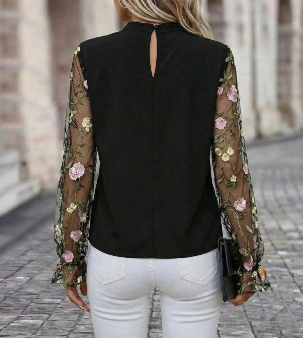 Kadın Uzun Kollu Yarı Balıkçı Yaka Tül Detaylı Ithal Krep Bluz