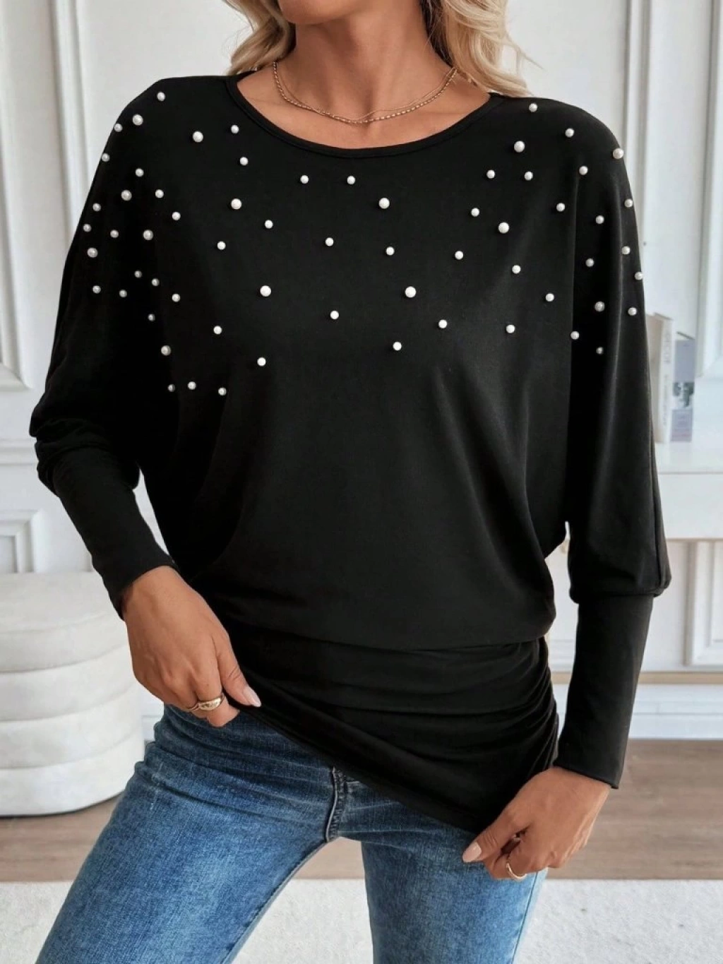 Kadın Uzun Kollu Yuvarlak Yaka Incili Viskon Bluz