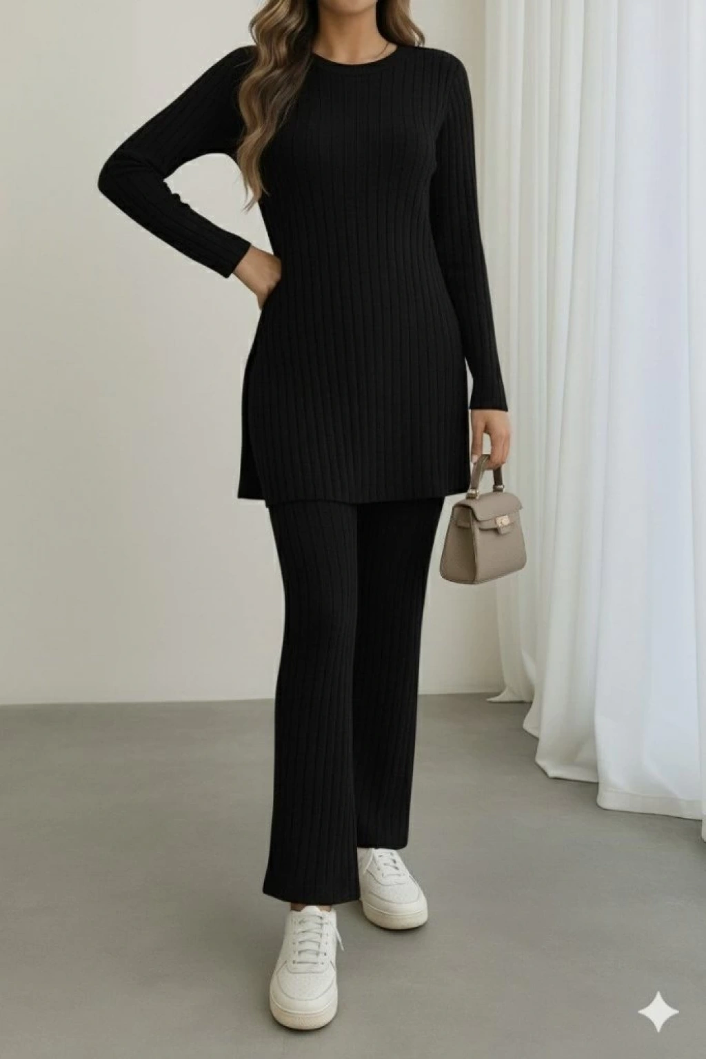Kadın Uzun Kollu Yuvarlak Yaka Yandan Yırtmaç Detaylı şardonlu Kaşkorse Bluz Ve Pantolon Ikili Takım