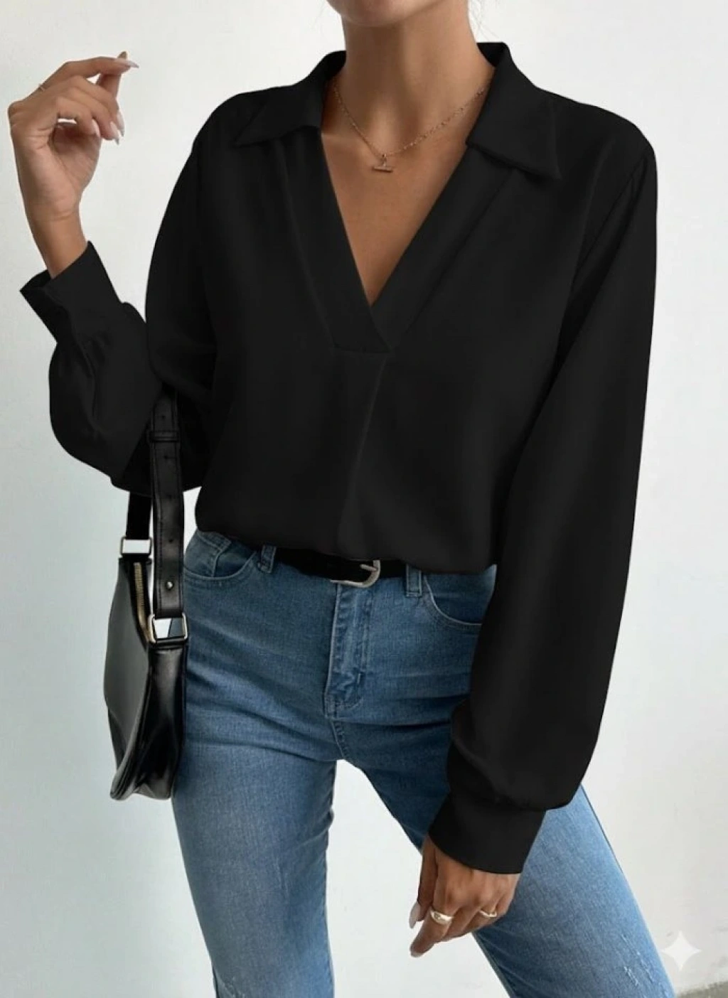Kadın V Yaka Uzun Kollu Mosskrep Kumaş Bluz