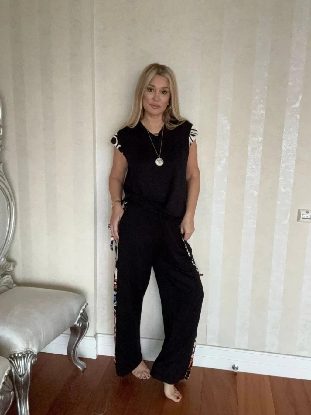 Kadın Yarasa Kol Dijital Baskı Detay Bluz Ve Yanı şerit Detay Kristal Kumaş Pantolon Ikili Takım