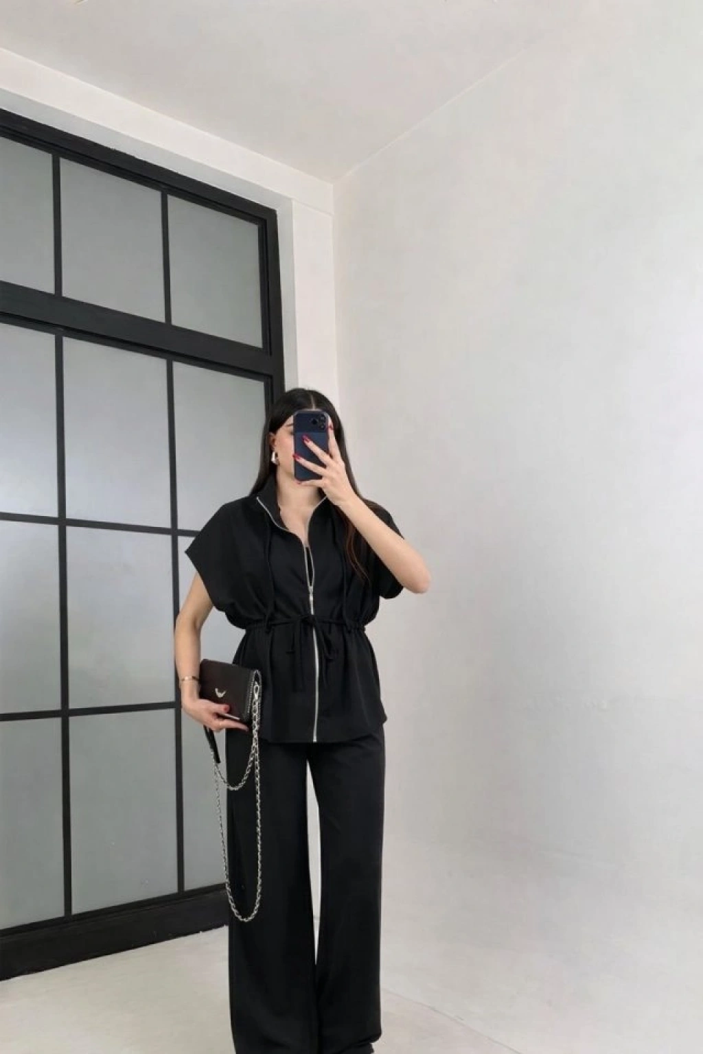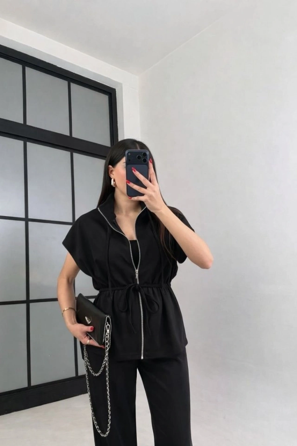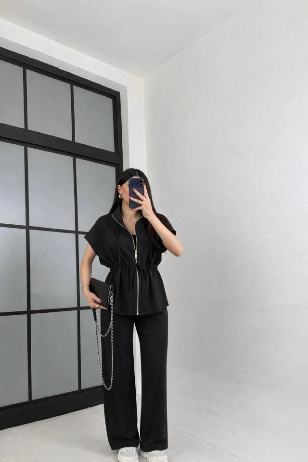 Kadın Yarasa Kol Fermuar Ve Lastikli Bağcık Detay Ceket Pantolon Ikili Takım