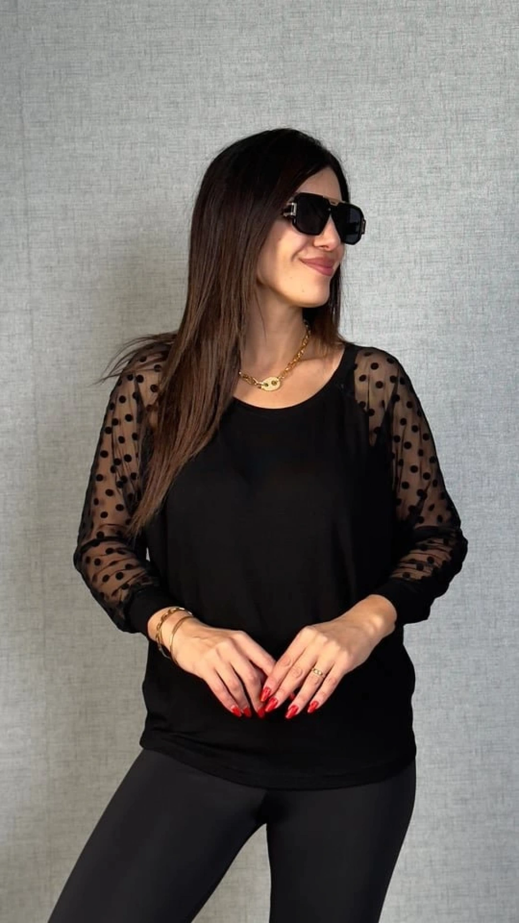 Kadın Yarasa Kol Puantiyeli Tül Detay Bluz