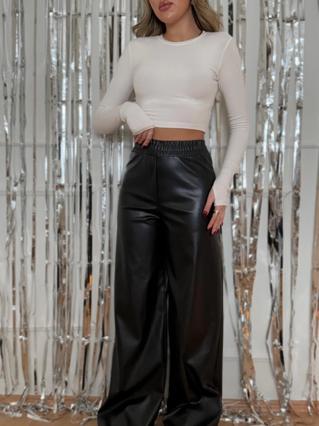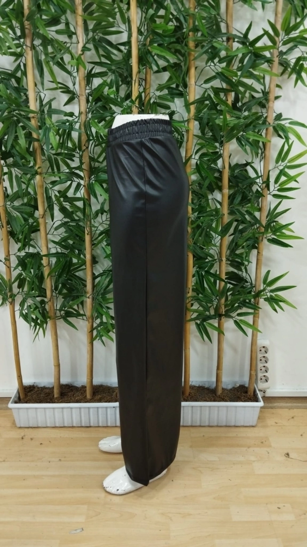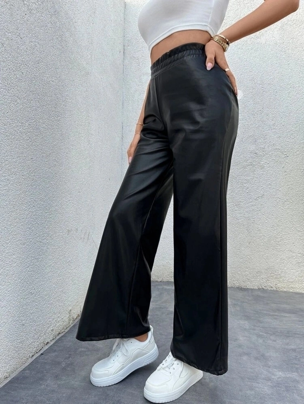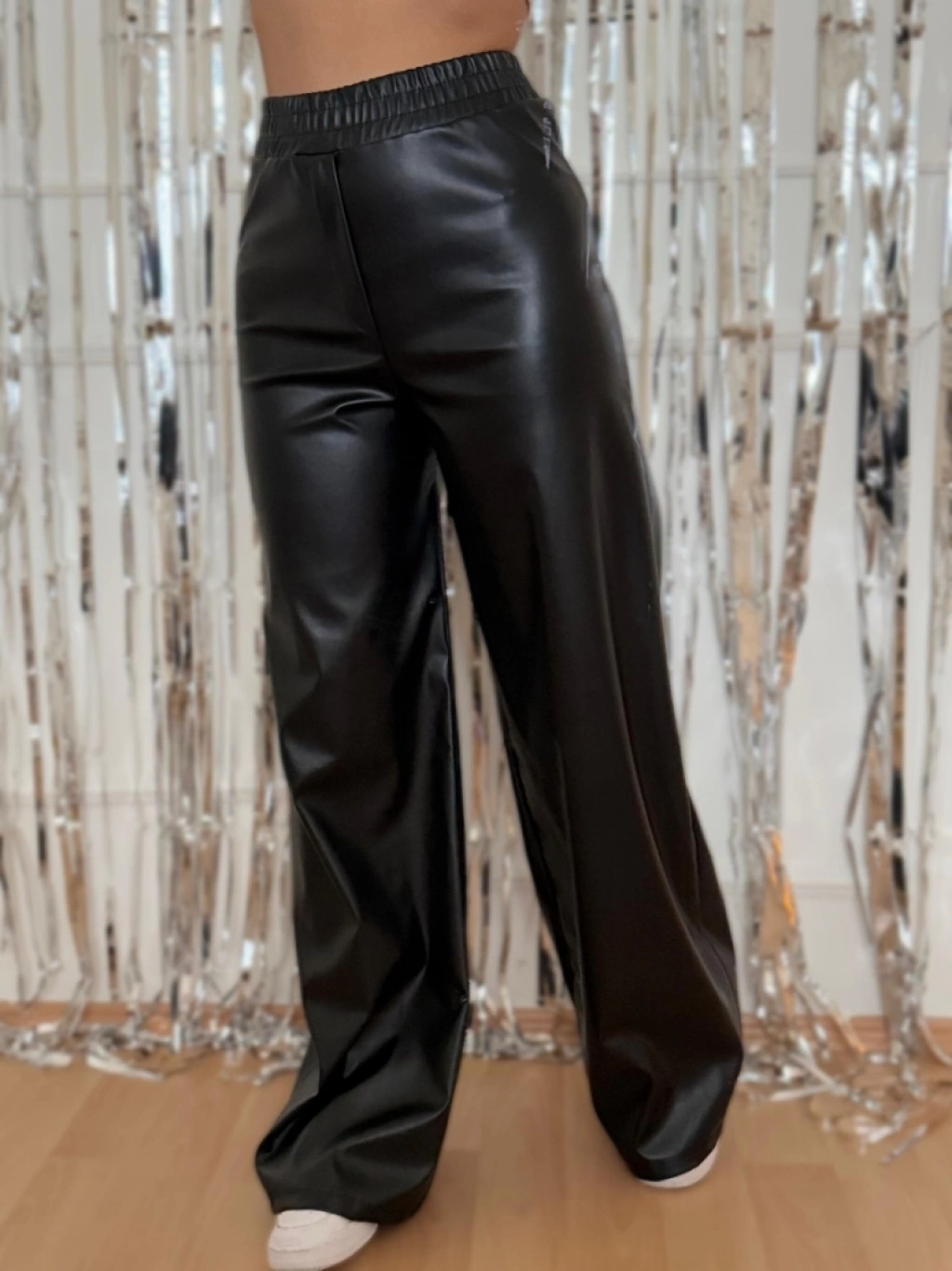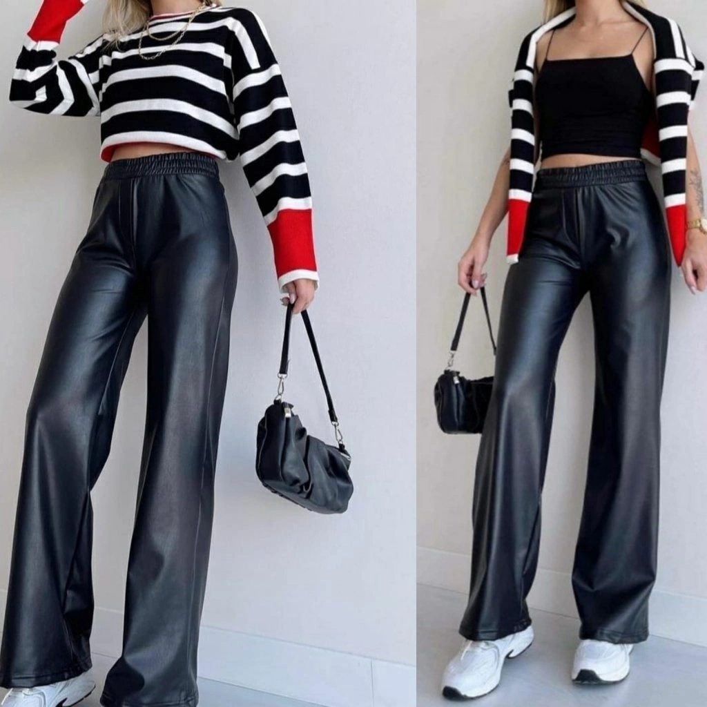 Kadın Yüksek Bel Beli Lastikli Geniş Paçalı Deri Pantolon