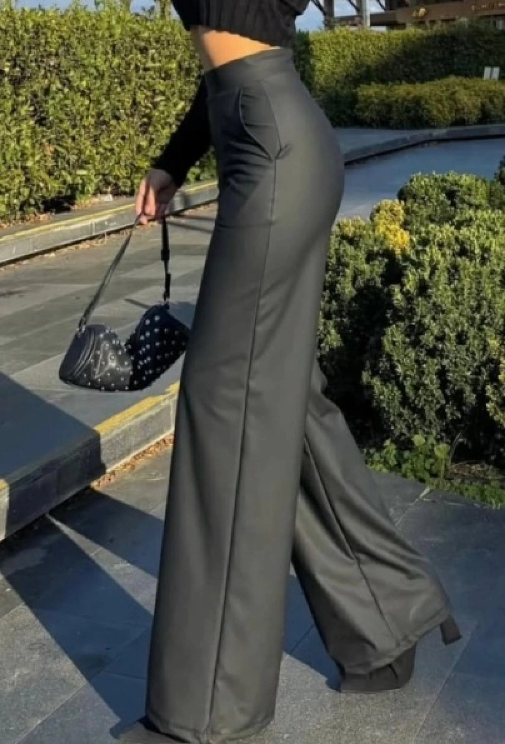 Kadın Yüksek Bel Cepli şardonlu Geniş Paçalı Mat Deri Pantolon
