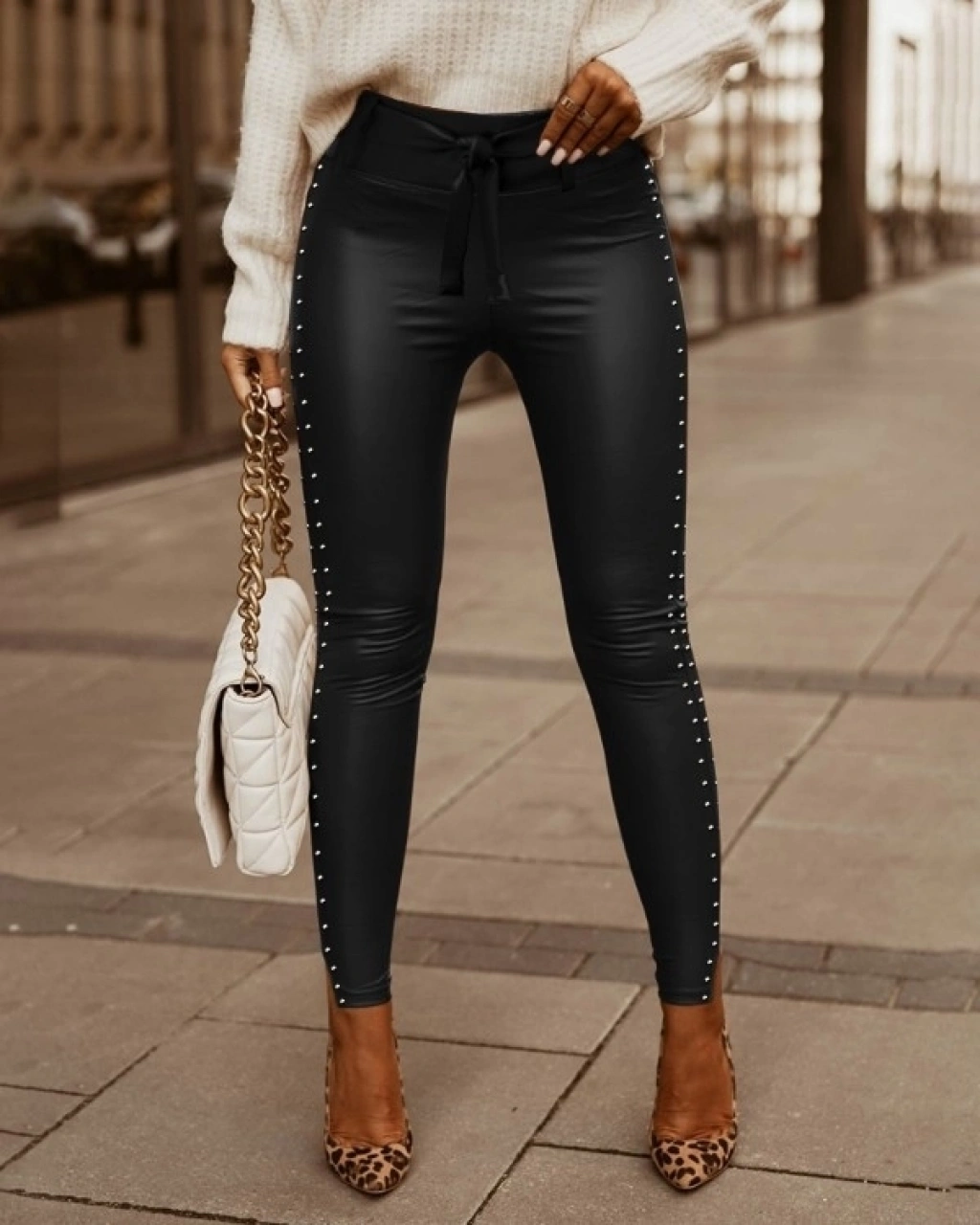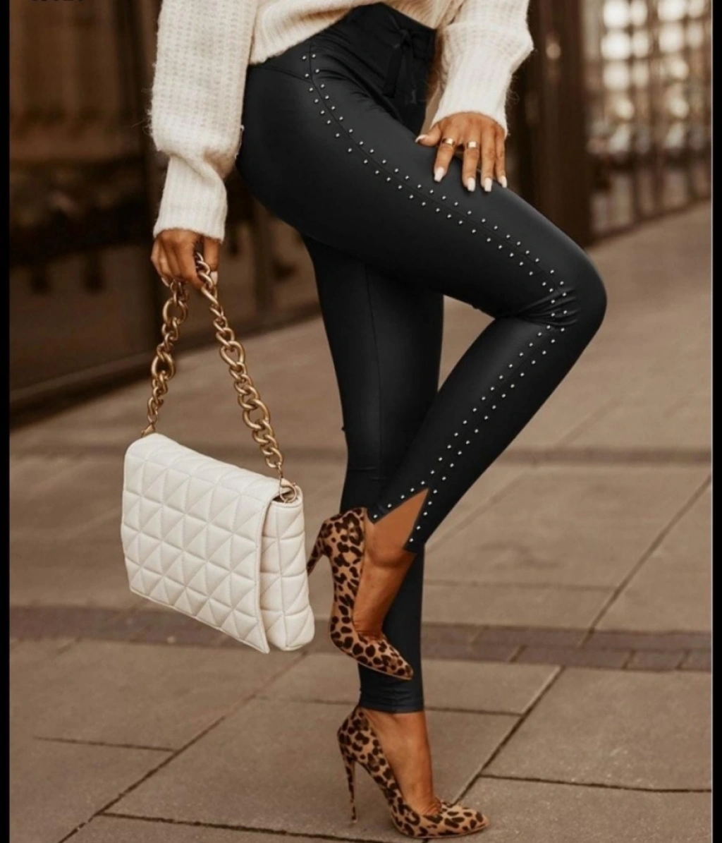 Kadın Yüksek Bel Yanlardan Incili Yırtmaçlı Uzun Deri Tayt