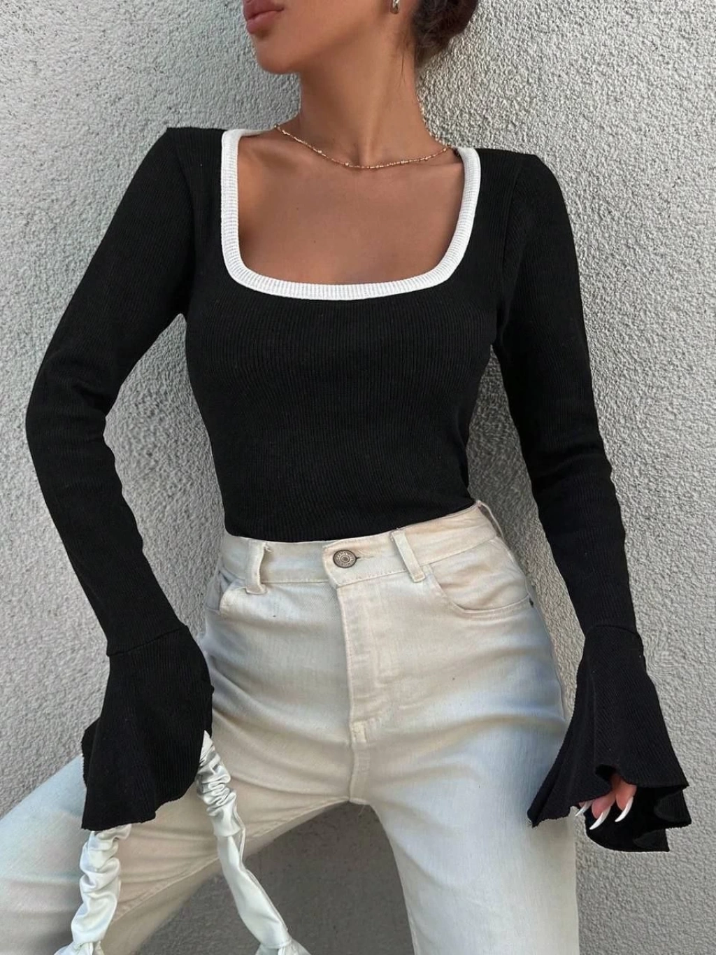Kare yaka garni detay ispanyol kol bluz siyah a3105