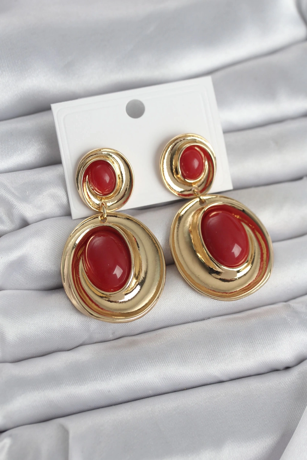Kırmızı Sallantılı Damla Model Gold Renk Vintage Kadın Küpe