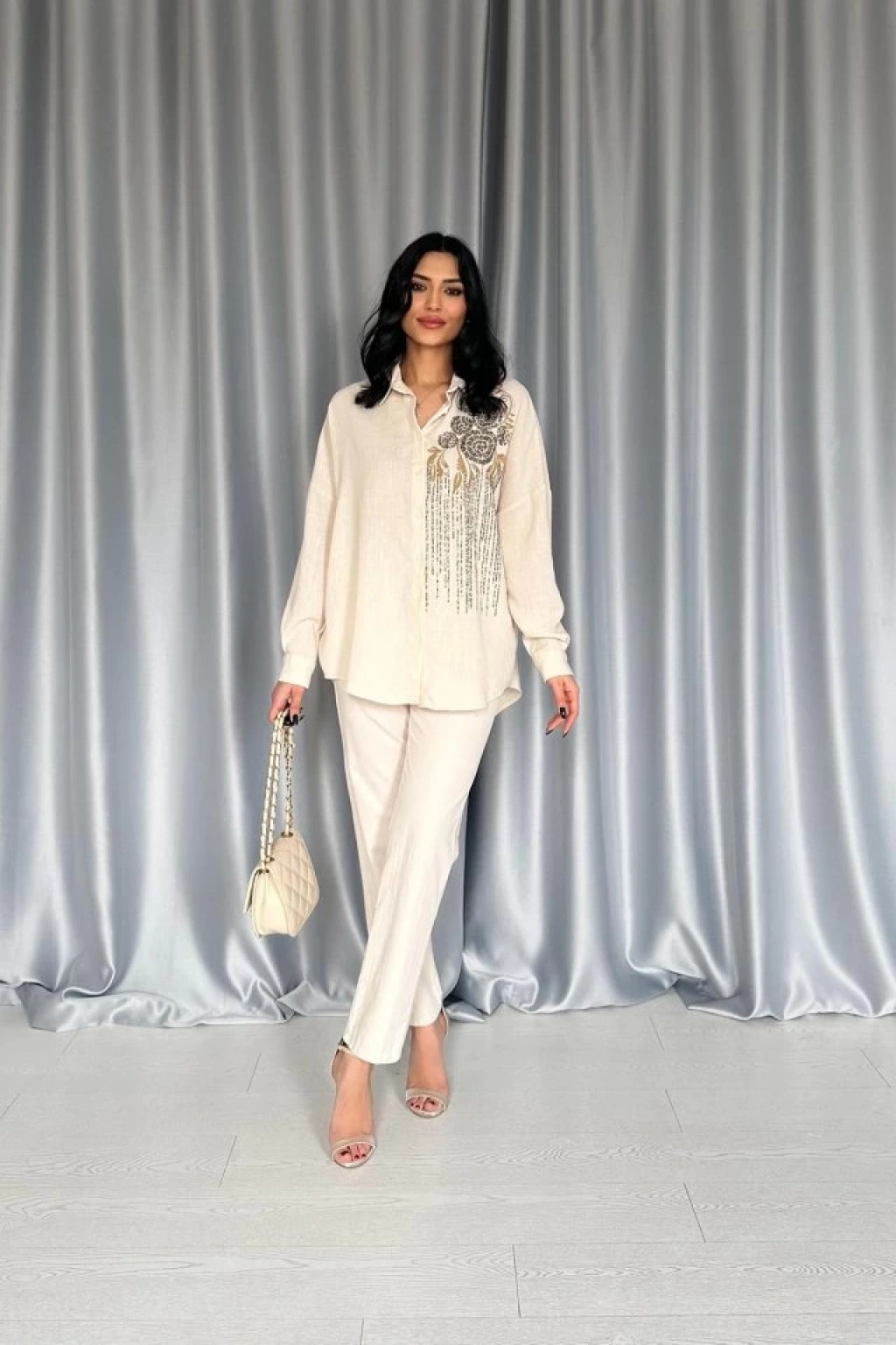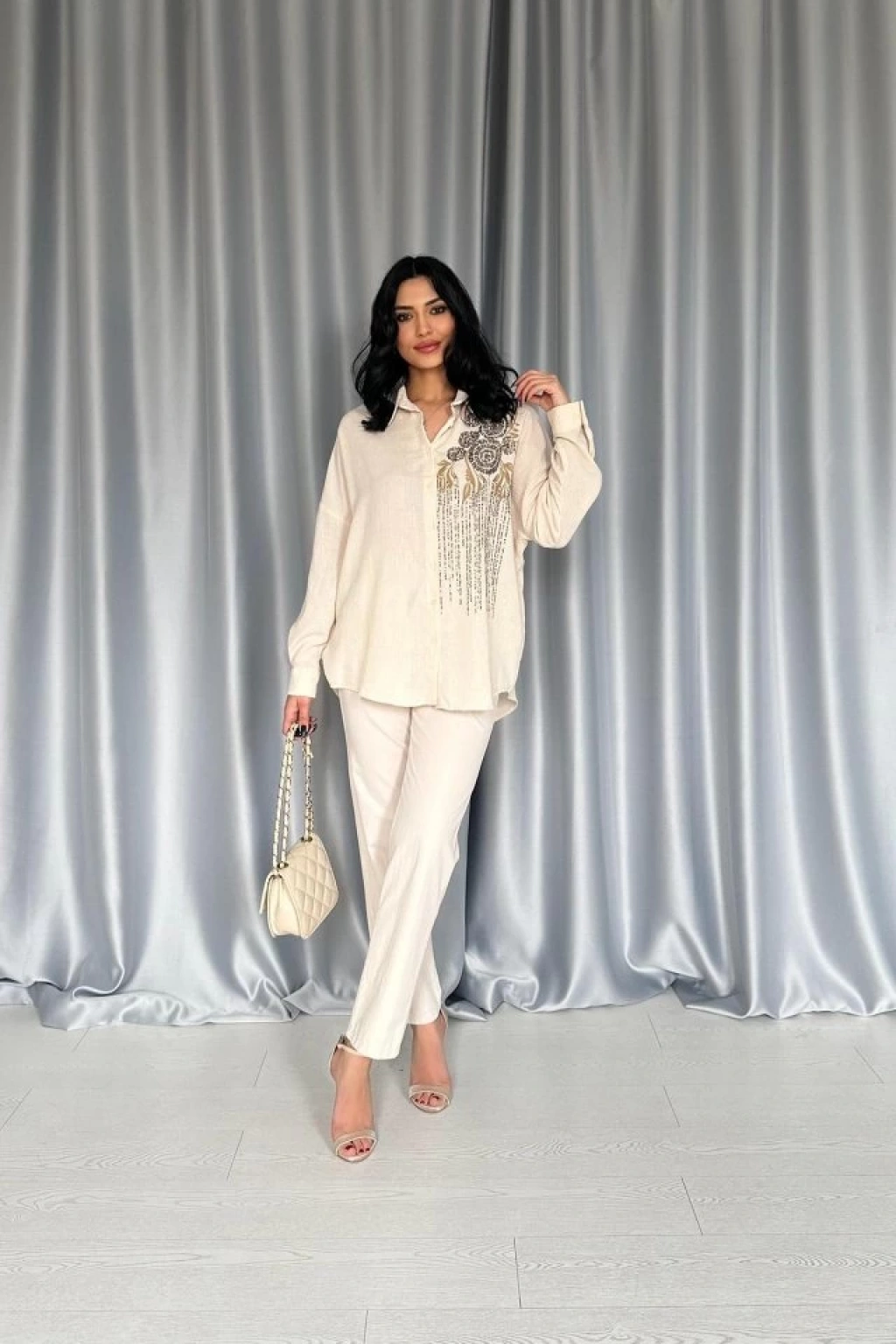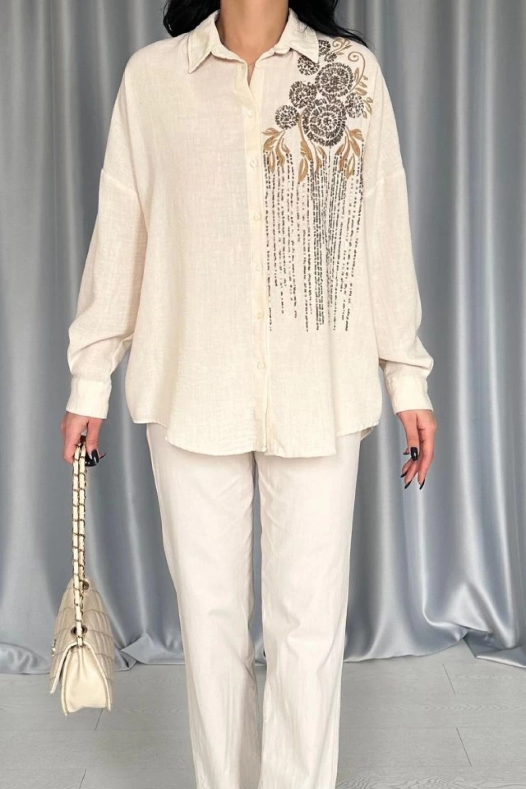 Krem Pulpayet Nakışlı Bedensiz Gömlek