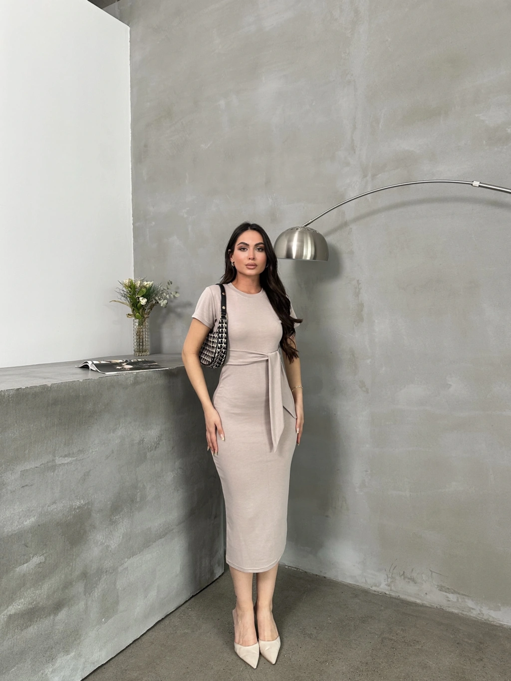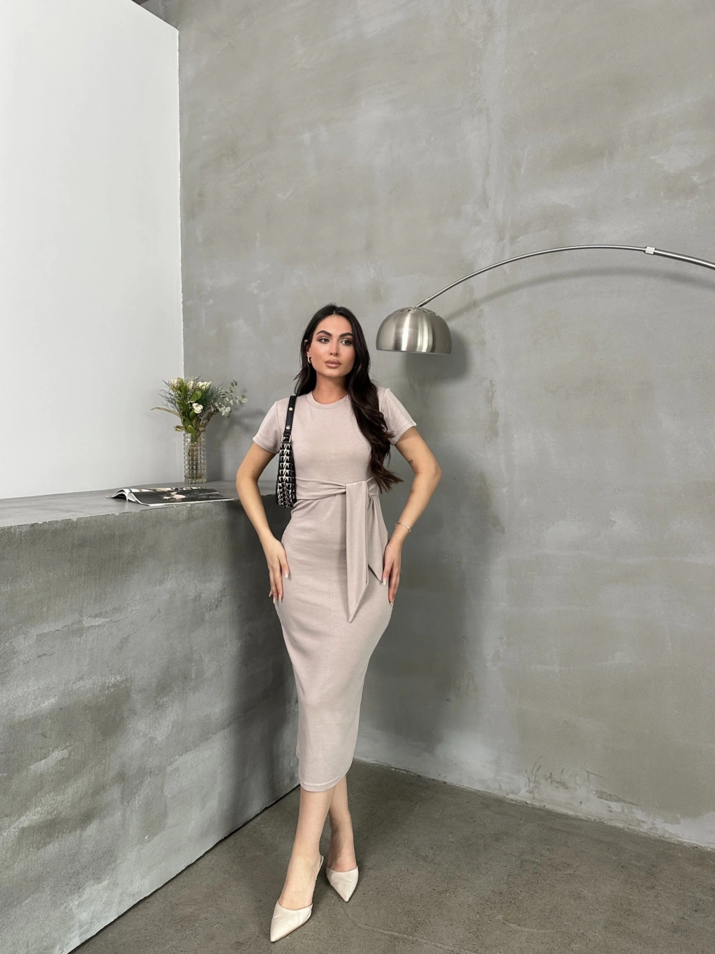 Kuşaklı mdl esnek kumaşlı elbise bej pt