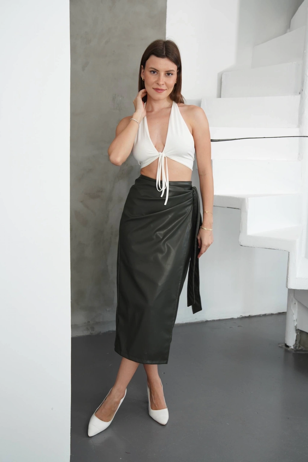 Kuşaklı uzun deri etek haki h26414