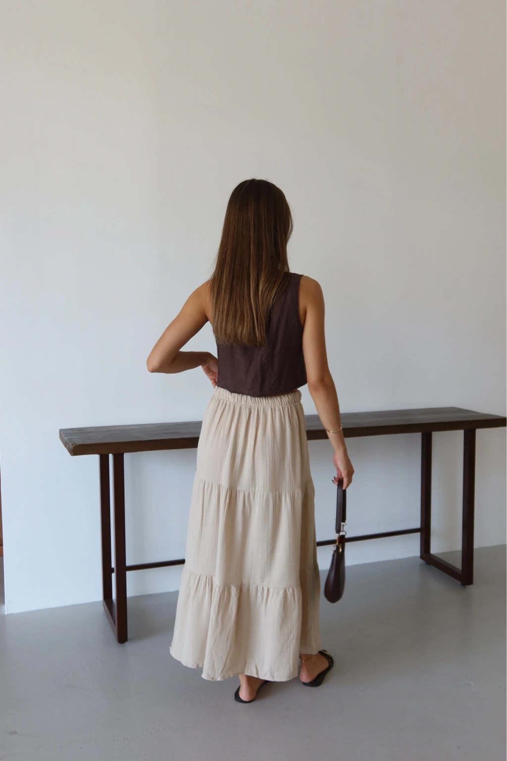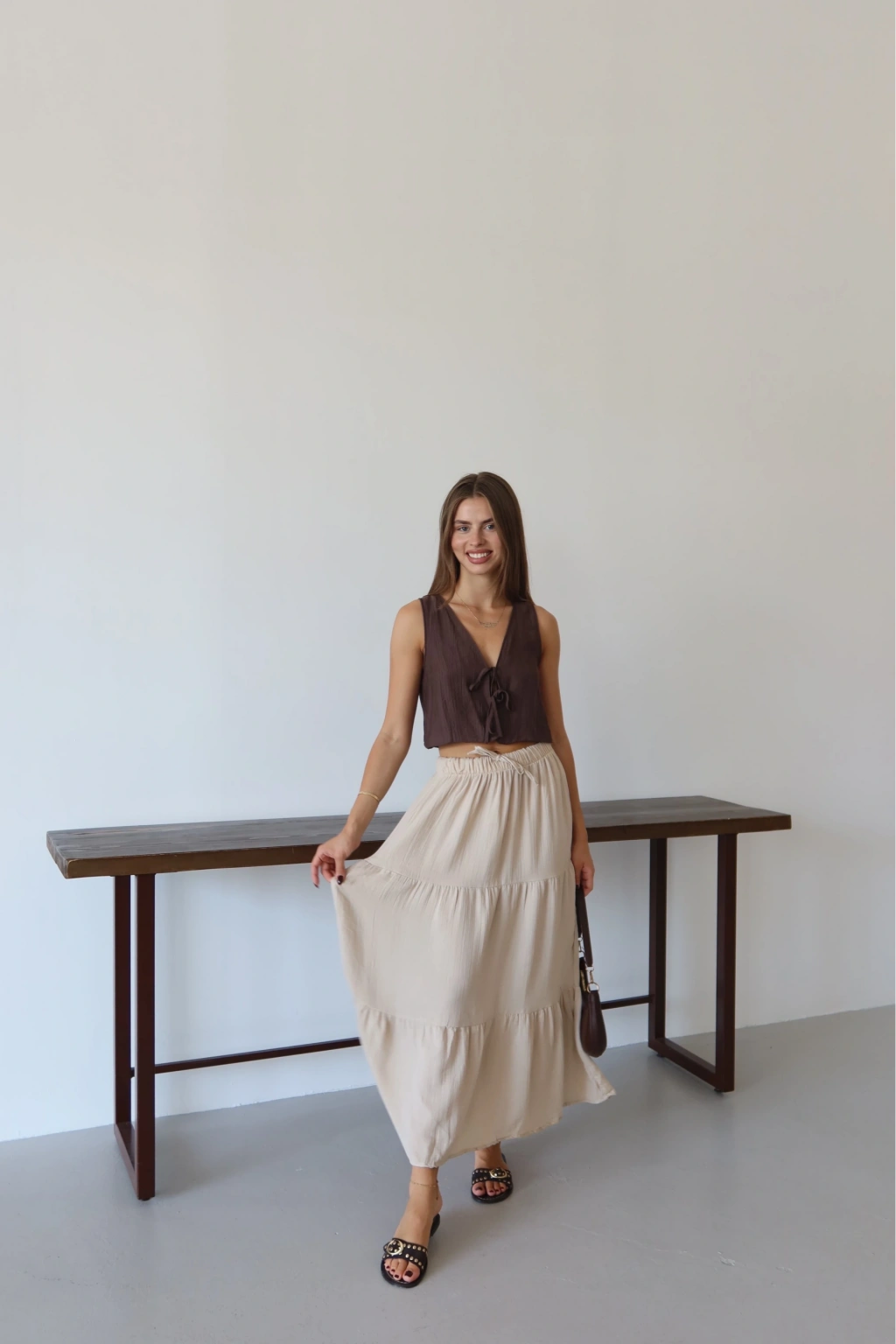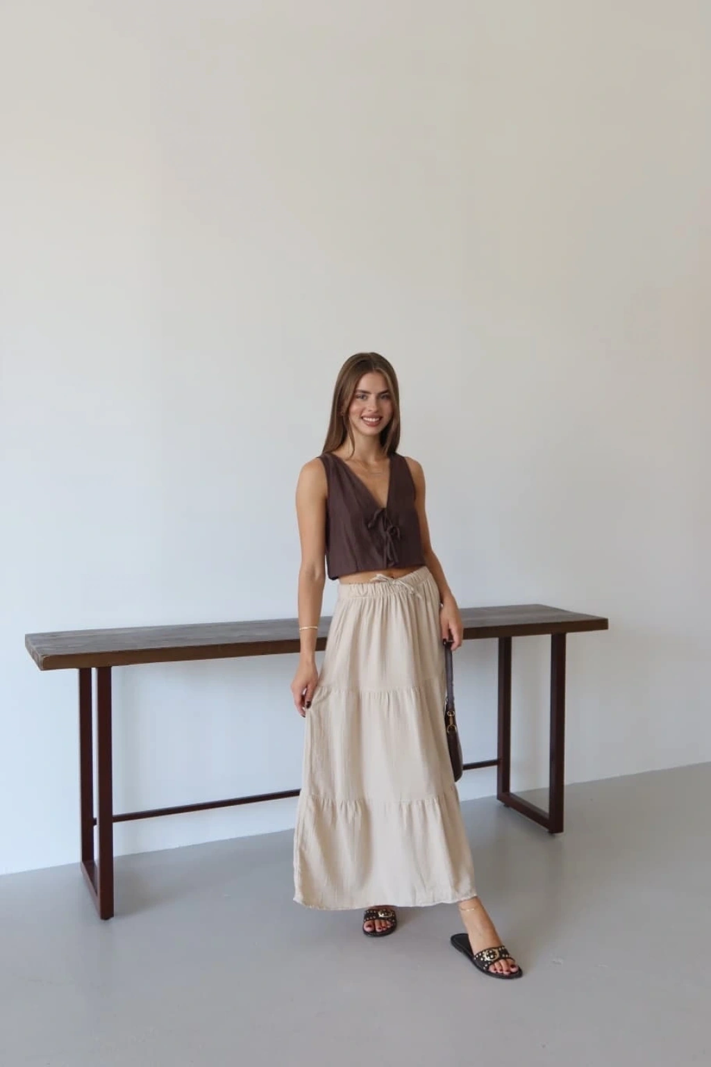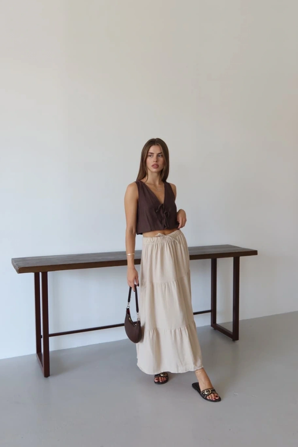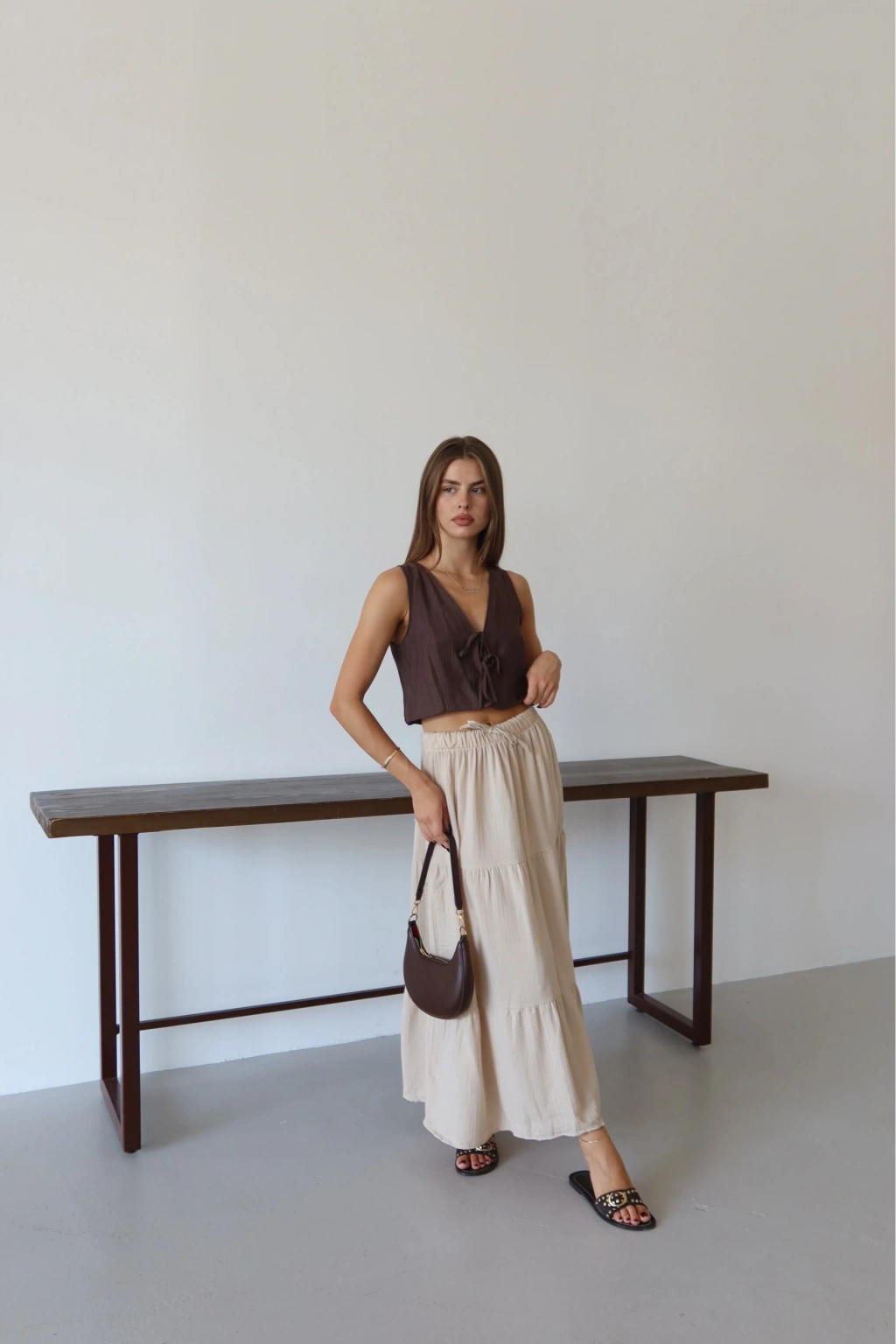 Cep detaylı oval kapaklı deri etek kahve h240048